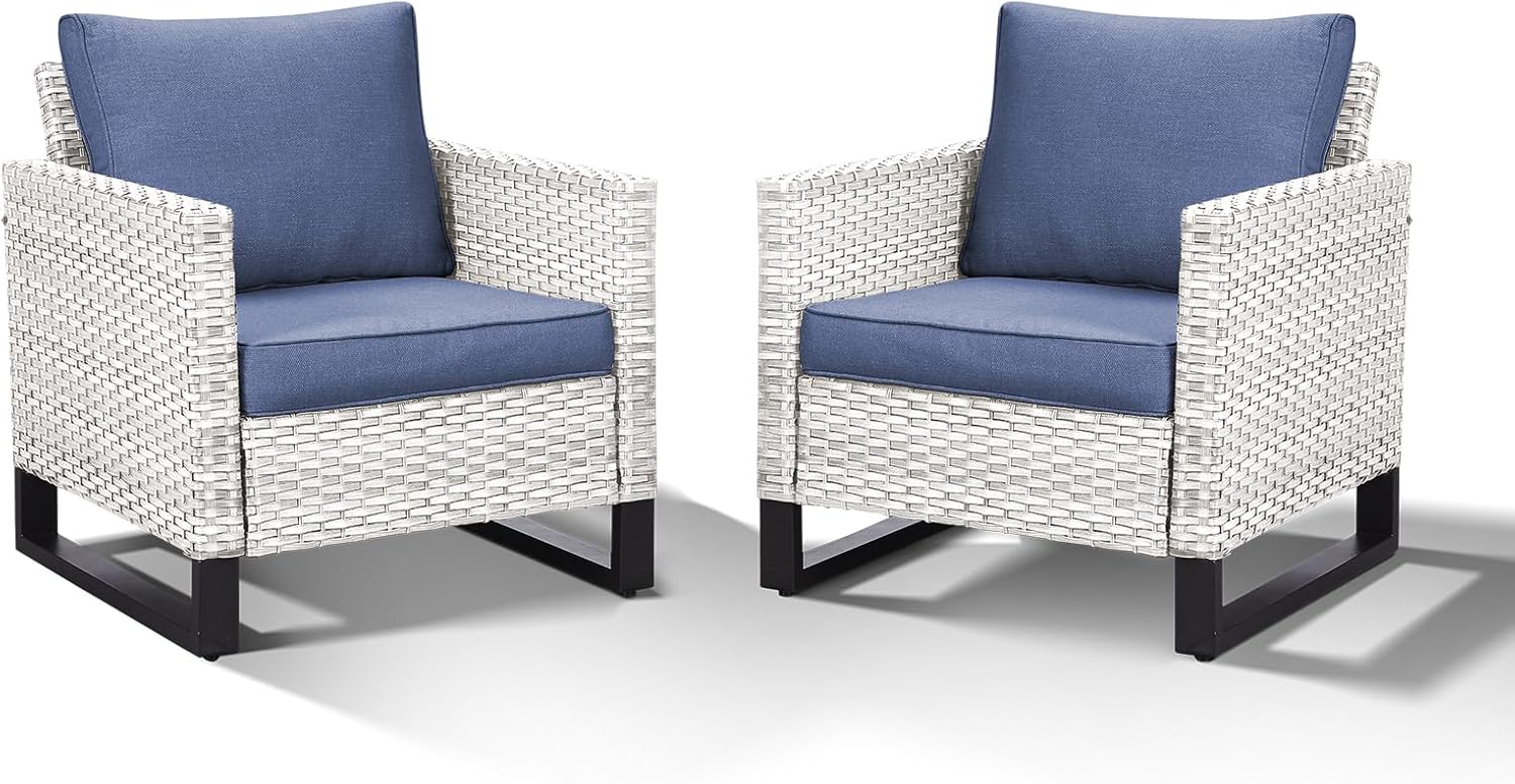 HUMMUH Outdoor Chairs PE Wicker Patio Dining Chairs Set of 2 Metal Frame Porch Chairs with 4 inch Seat Blue Cushions