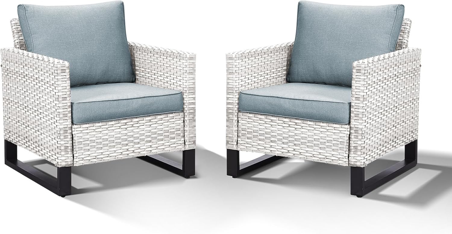 HUMMUH Outdoor Chairs PE Wicker Patio Dining Chairs Set of 2 Metal Frame Porch Chairs with 4 inch Seat Light Blue Cushions