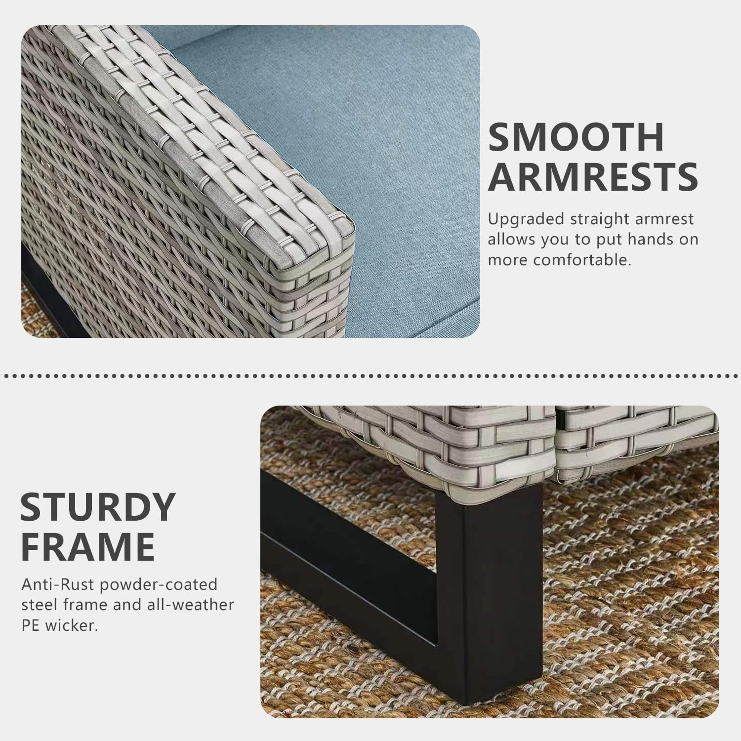 - Deep-seating Design:The Deep-sitting chairs with long and wide armrests, ergonomic backrest, matched with comfortable 5-inch thick sponge-padded cushions,The cushions offers good resilience, not easy to deform or slide, also protect your lumbar and offer a comfortable sitting experience.