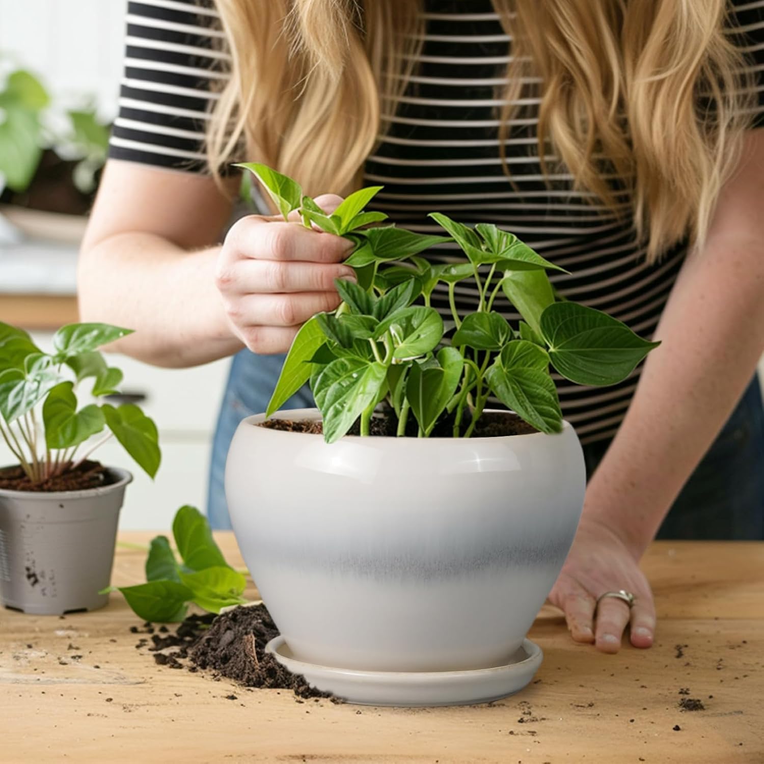 - Drainage Hole and Saucer: There is a drainage hole at the bottom of the ceramic flower pot, which can discharge excess water and benefit the growth of plants; the lightweight ceramic saucer can not only keep your desktop clean, but also convenient your movement
