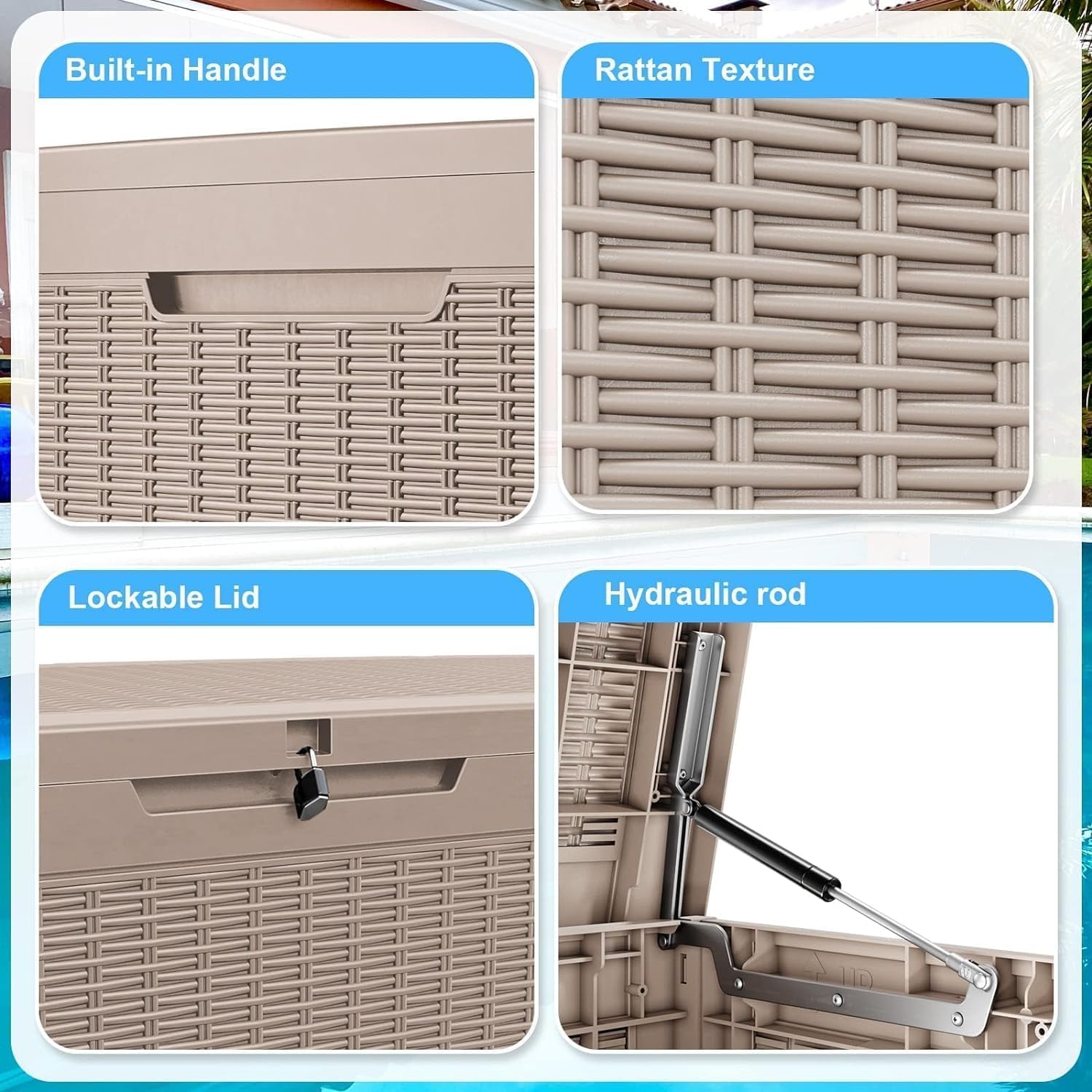 - SAFETY & LOCKABLE DESIGN - Equipped with a hydraulic rod, this storage box ensures smooth and safe lid operation, preventing accidental pinching. The built-in lockable design provides an additional layer of security, keeping your outdoor valuables safe and protected.