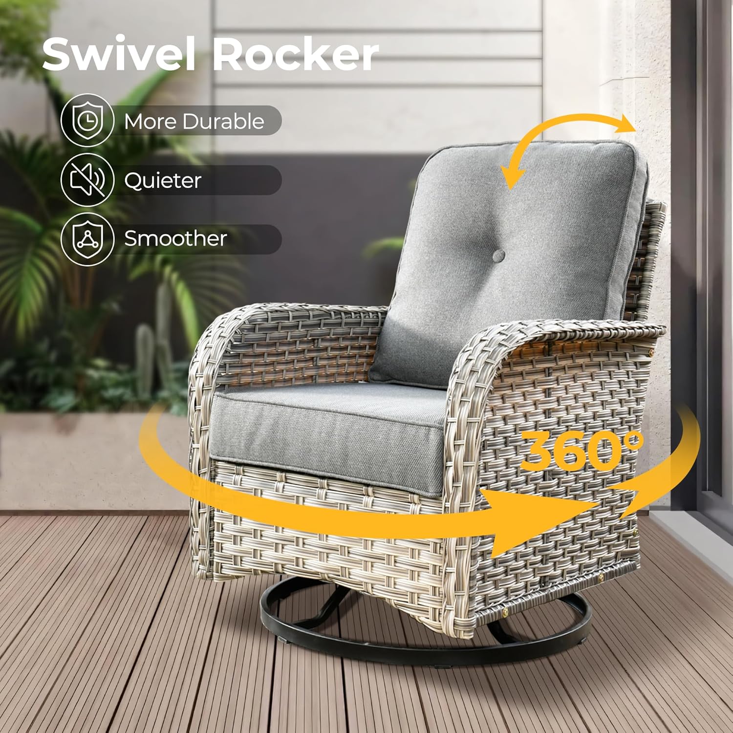 - Swivel Rockers: Designed for both 360° swivel and front to back rocking.Selected thicken and stable mechanism for smoother and quieter rotation as well as safer glider rocking