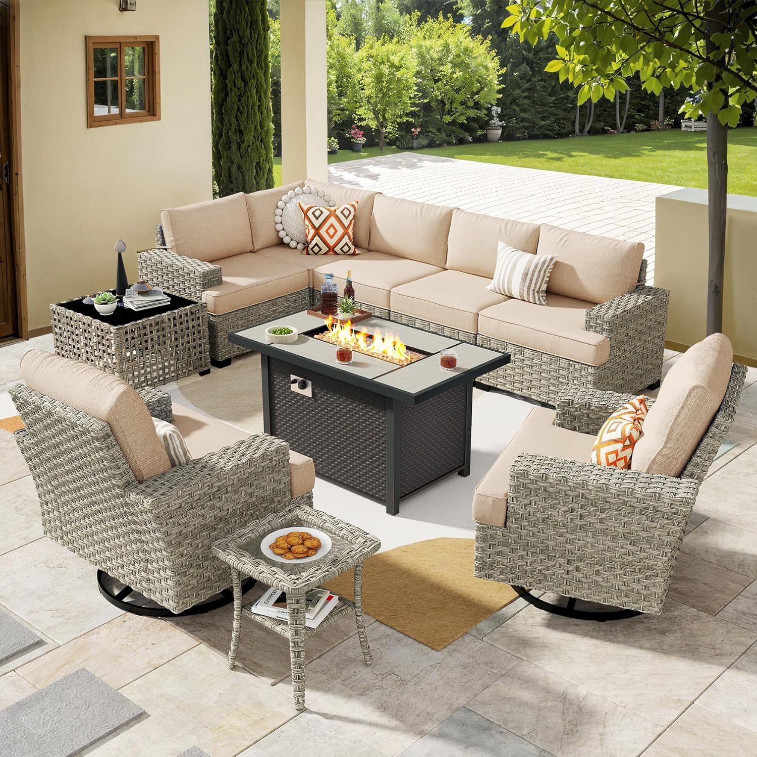HOOOWOOO Outdoor Sectional Patio Furniture Set with Fire Pit Table,10 Pieces Wicker Conversation Sets L Shaped Couch,Extra Deep Out Door Sofa Outside Furniture with Swivel Chairs,Beige