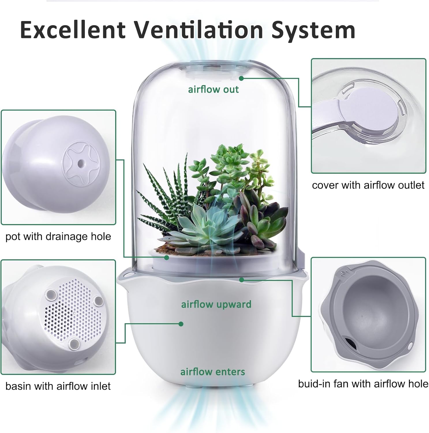 - ăSpecial Design Terrarium For Succulents, Carnivorous Plants & Venus Fly Trapă LED grow light for Enough Lighting,build-in fan for Better Ventilation, and the transparent cover make a good air Circulation System. All of the designs offer a suitable condition for succulents, promotes photosynthesis, and grows well and faster.