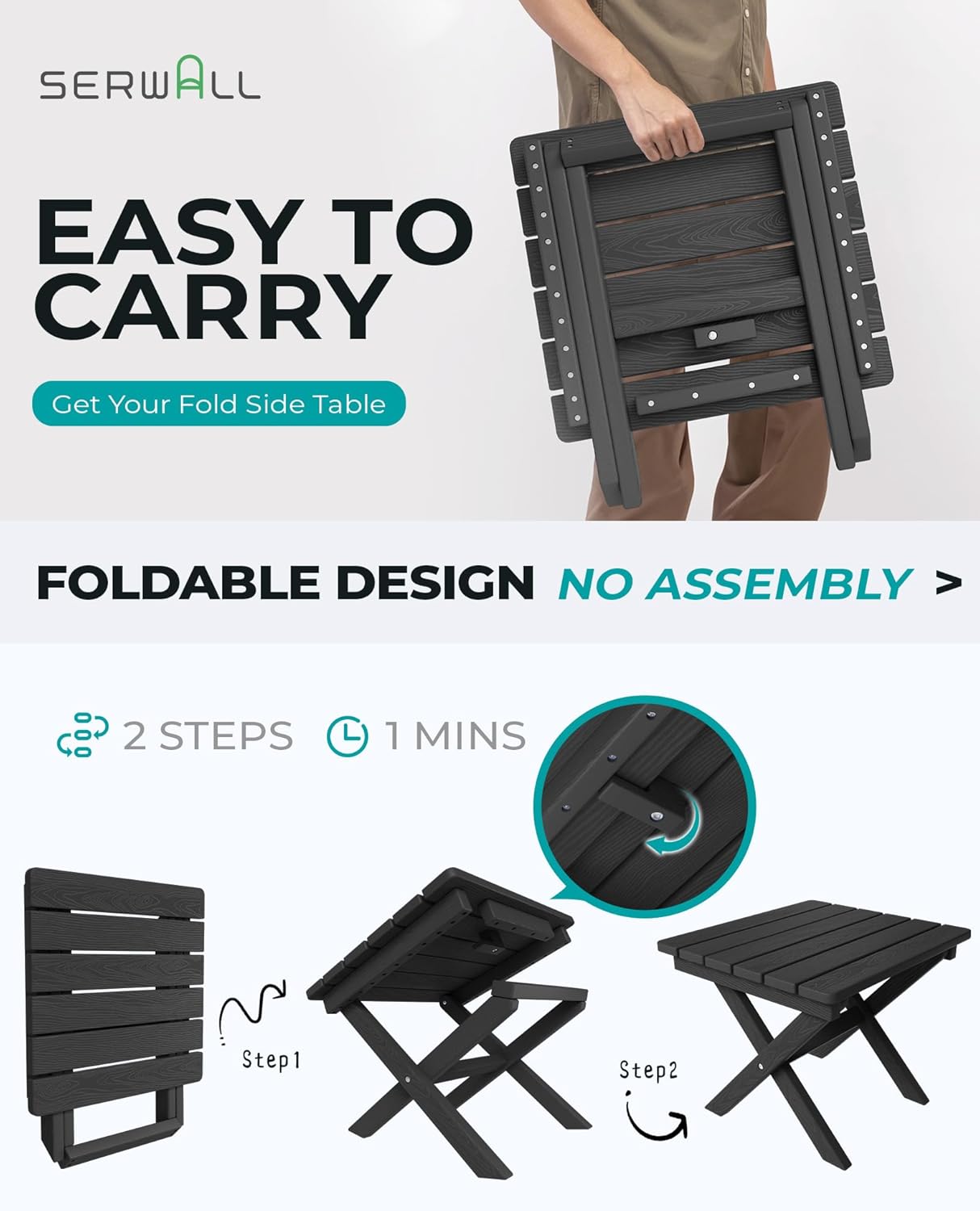 - [Indoor and Outdoor Use] This SERWALL folding side table is not just a small outdoor side table; it's a stylish addition to patios, gardens, and indoor spaces. Its versatility makes it suitable for a variety of settings.