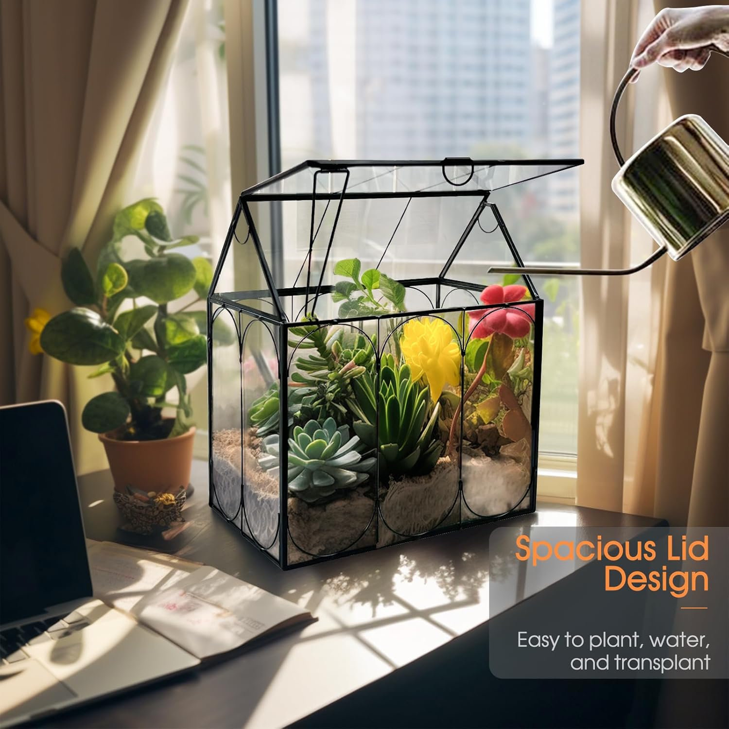- Geometric Plant Terrarium: The unique house shape glass terrarium with lid and a little prop rod that can be used to hold the lid up. You can prop up the lid of the house, making it convenient to water or transplant your plants, and providing fresh oxygen for your plant inside.