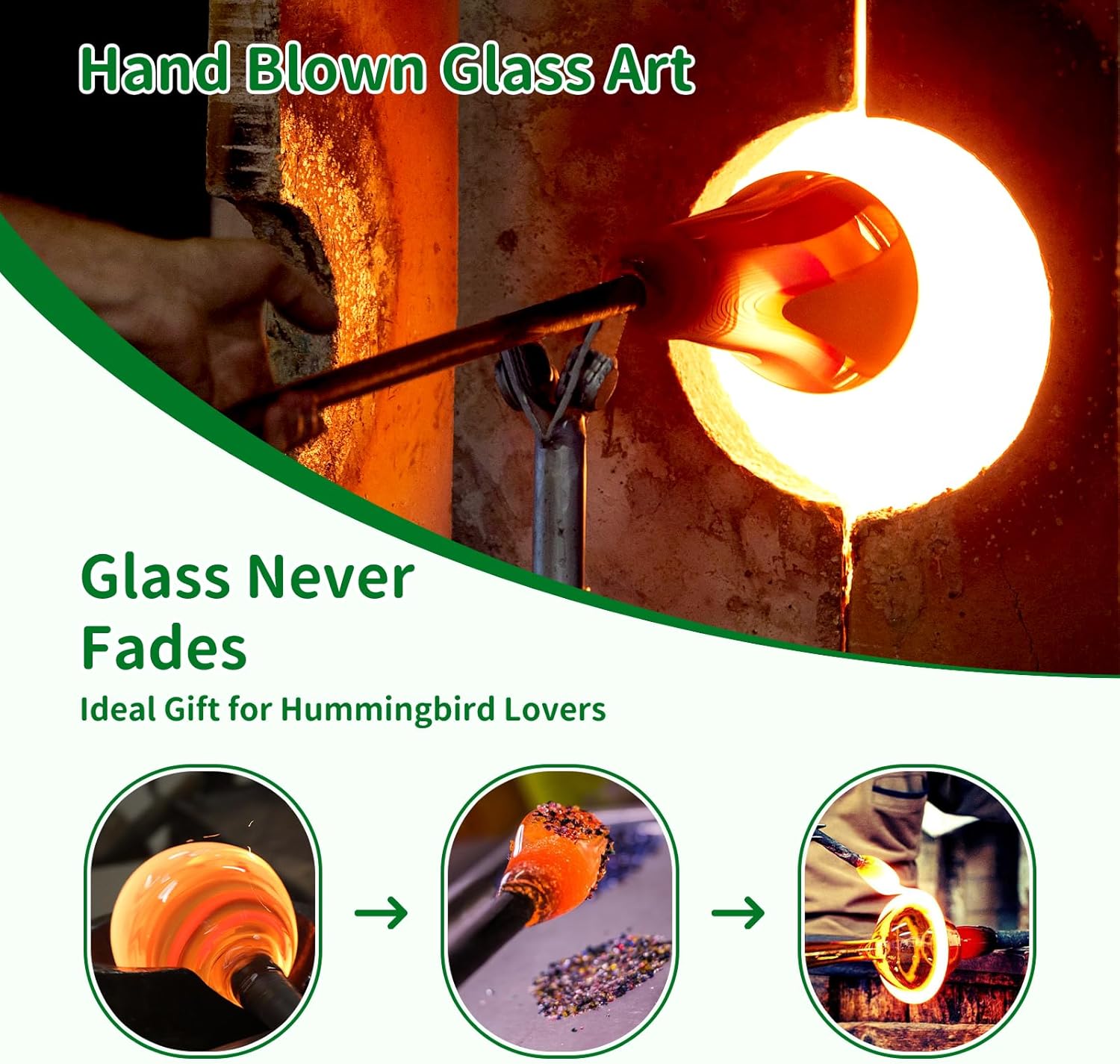 - Hand Blown: Each bird water feeder is carefully hand-blown by skilled artisans, making each one unique. The glass color is embedded within a double-layer design, ensuring bright, vibrant, and fade-resistant colors. The thick rubber ring at the bottom prevents leaks, making it a perfect addition to your garden.