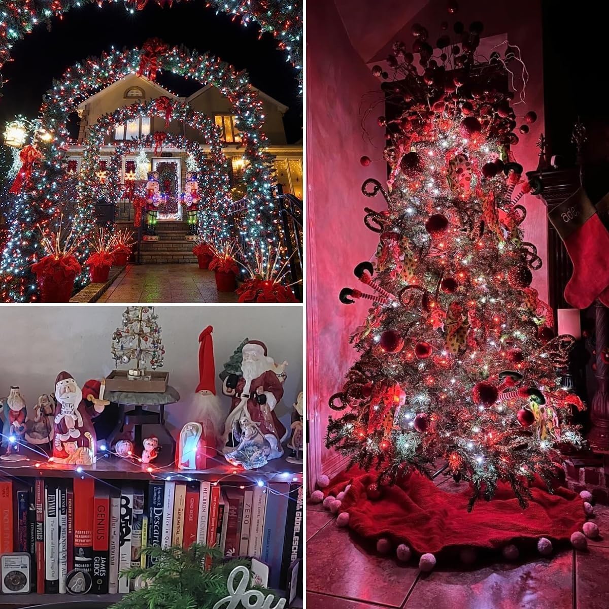 - Brilliant Outdoor Christmas Decor: 4 Pack each 100 LED starry-style solar christmas lights with red and white light accent your space with a unique, inviting glow. Each lights with 33ft length is perfect to put around a garden or porch railing.Blue&White solar lights were the finishing touch for a back yard bbq, party, wreath, fence, patio, pools, bush, holiday, indoor, outdoor. In the dark, the wire fades to invisible, leaving only the fairy lights, create a classy and romantic atmosphere.