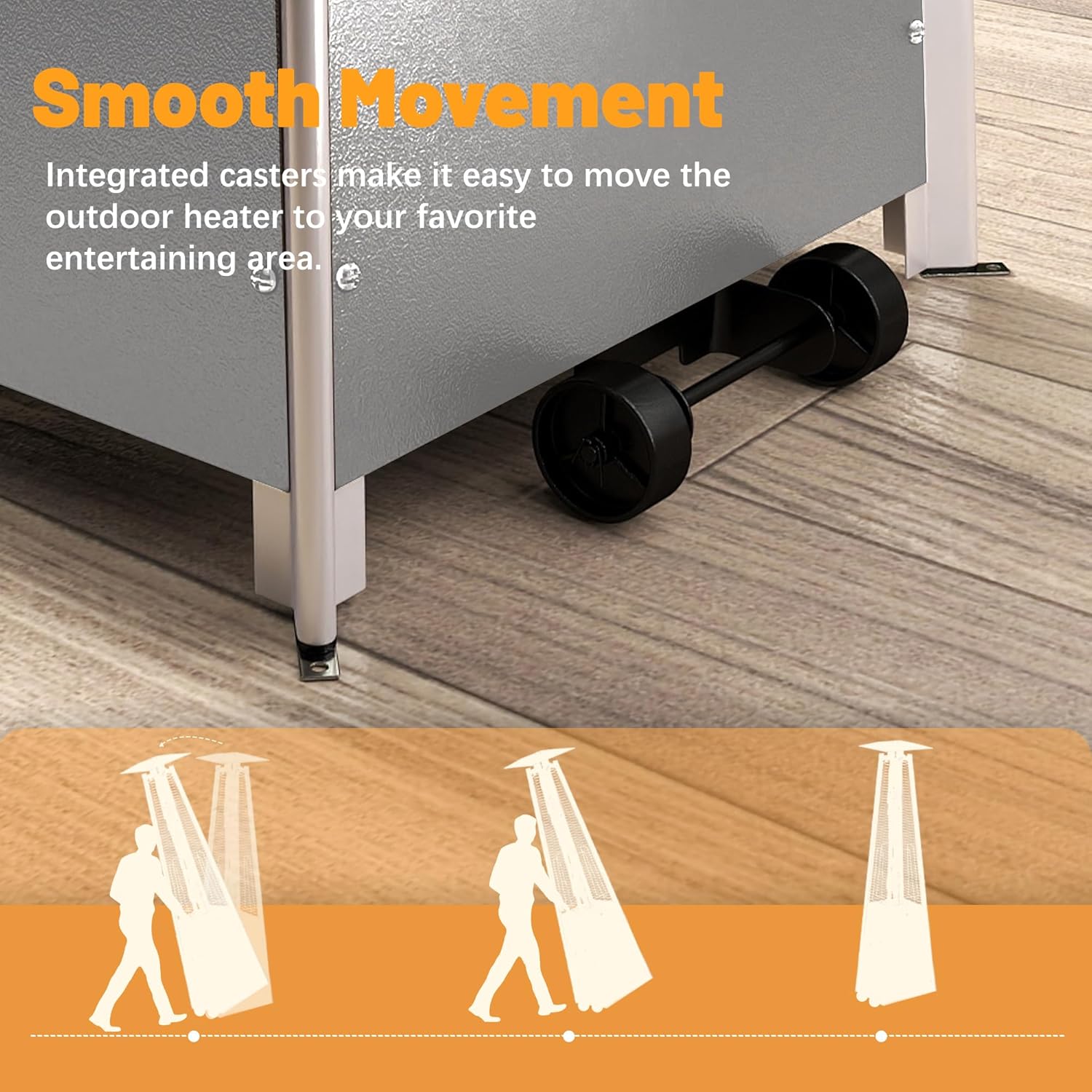 - 【Patio Heater for Outdoor Use】FOOWIN Patio Heater is equipped with built-in wheels on its base, allowing you to easily move the heater to anywhere you need heating. It not only dispels the chill, making you can enjoy the outdoors in warmth, but also adds good ambiance to your patio, backyard, garden and deck, creating a cosy and pleasant outdoor environment.