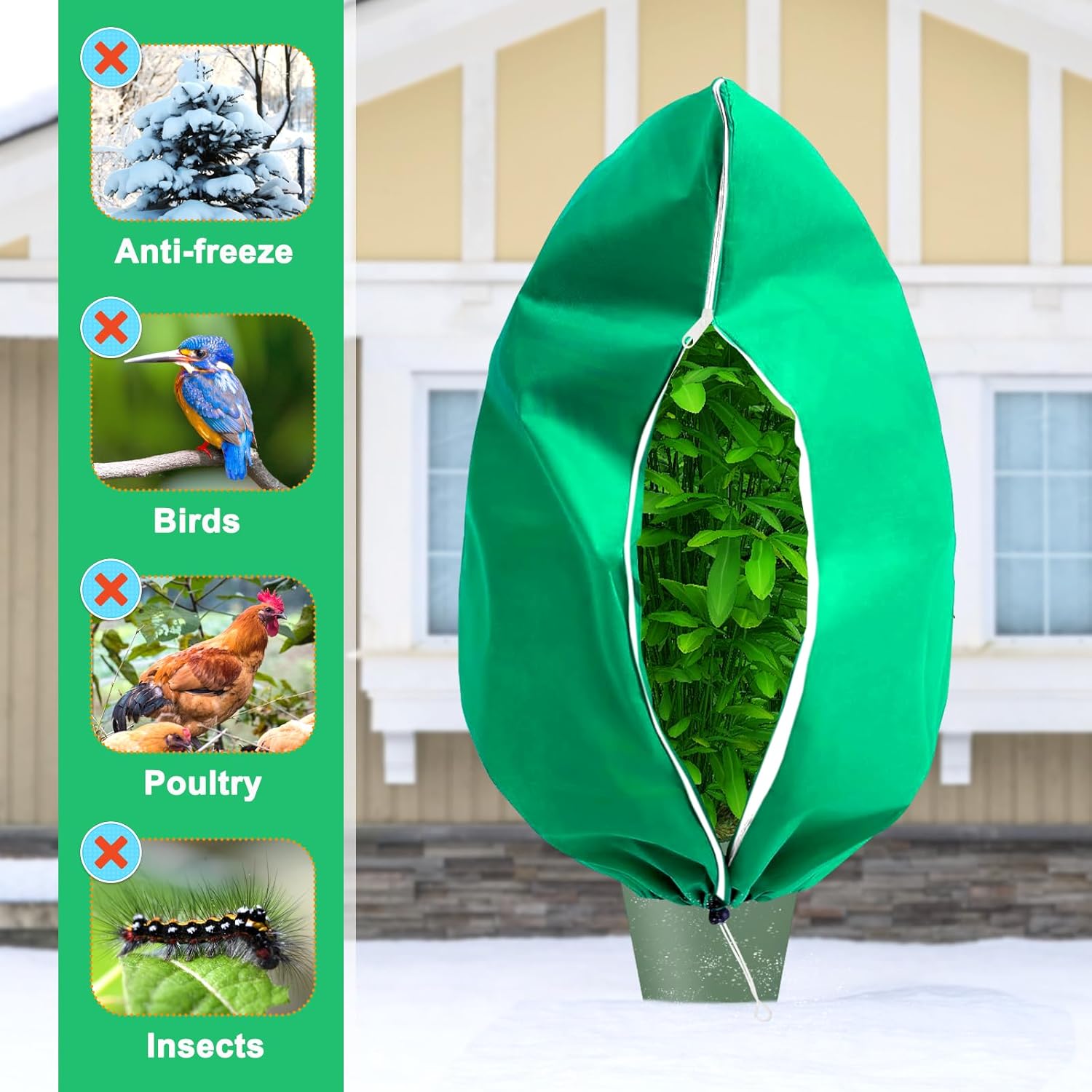 - Drawstring and zipper design: The anti freezing design of the plant cover adopts easy-to-use zippers and drawstrings. The zipper design is easy to cover or remove, making it convenient for watering or checking the condition of plants. The rope design can prevent damage to plants caused by cold ground winds.