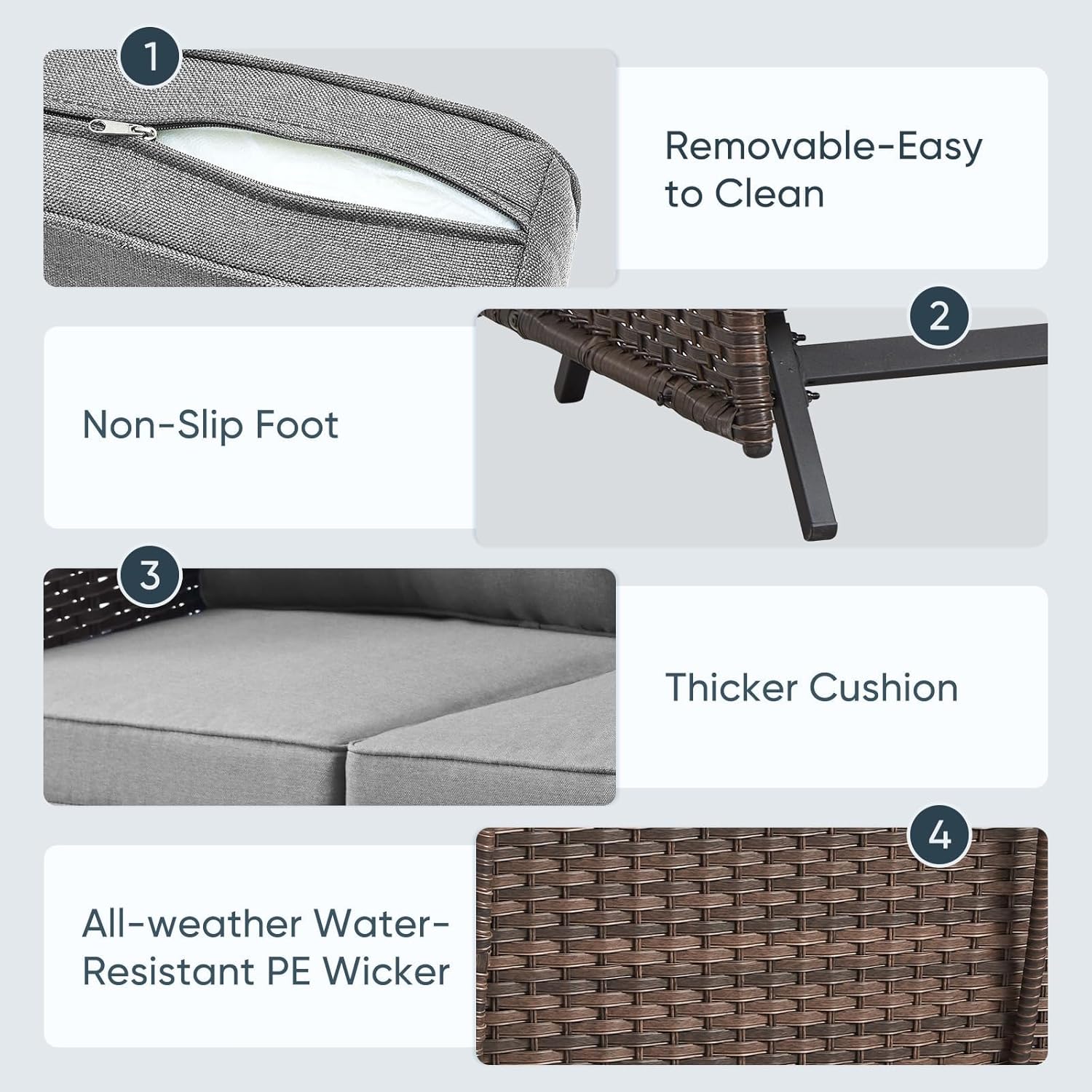 - 3.All-weather PE Wicker Furniture: Featuring a long-lasting woven finish, this style is not only incredibly durable but also provides a versatile appearance. The handcrafted details of this material allow this patio furniture set to blend seamlessly with your outdoor decor.