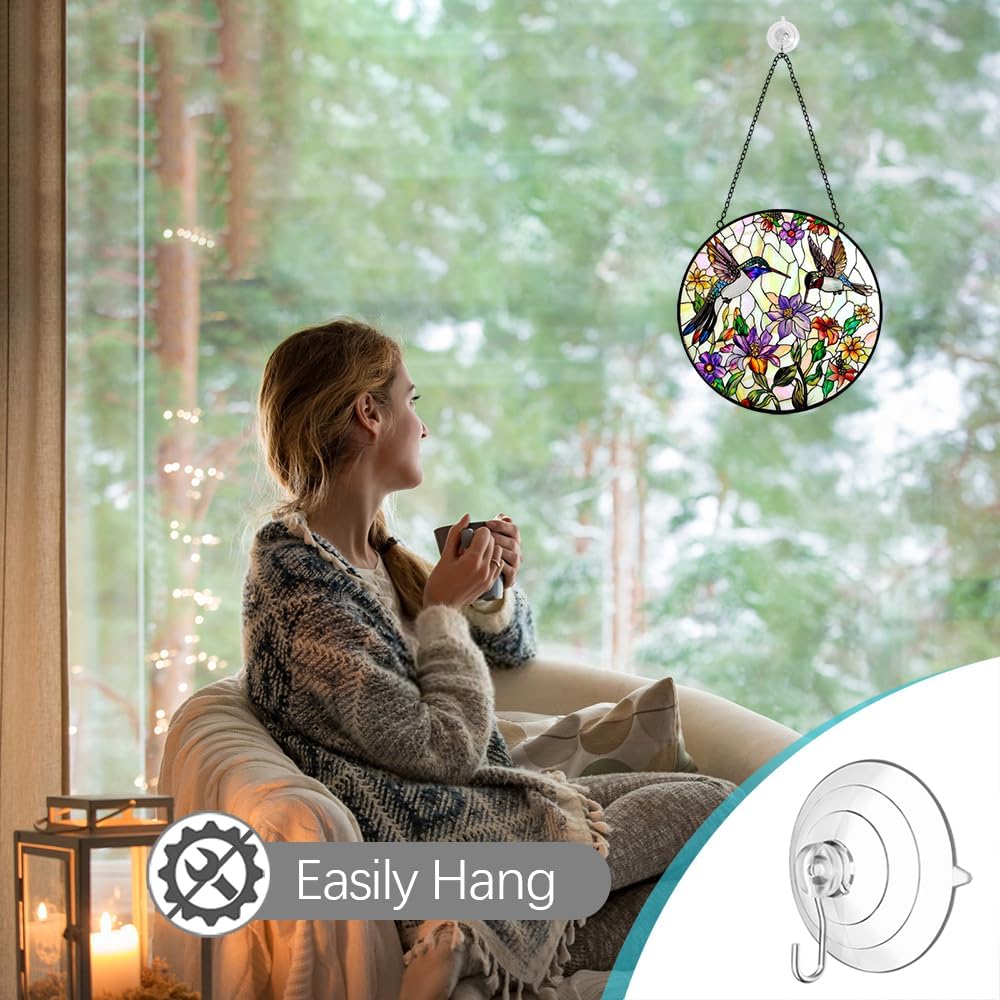 - Easy to Hang Window Suncatcher: Hummingbird suncatcher package comes with a suction cup hook and easy hanging stained glass sun catcher in indoor or outdoor occasion. The suction cup provided is an upgraded version, which is transparent almost invisable and abolutely blend our decoration style and eaily reuse in other place, it also comes with an a metal chain for quick and easy hanging