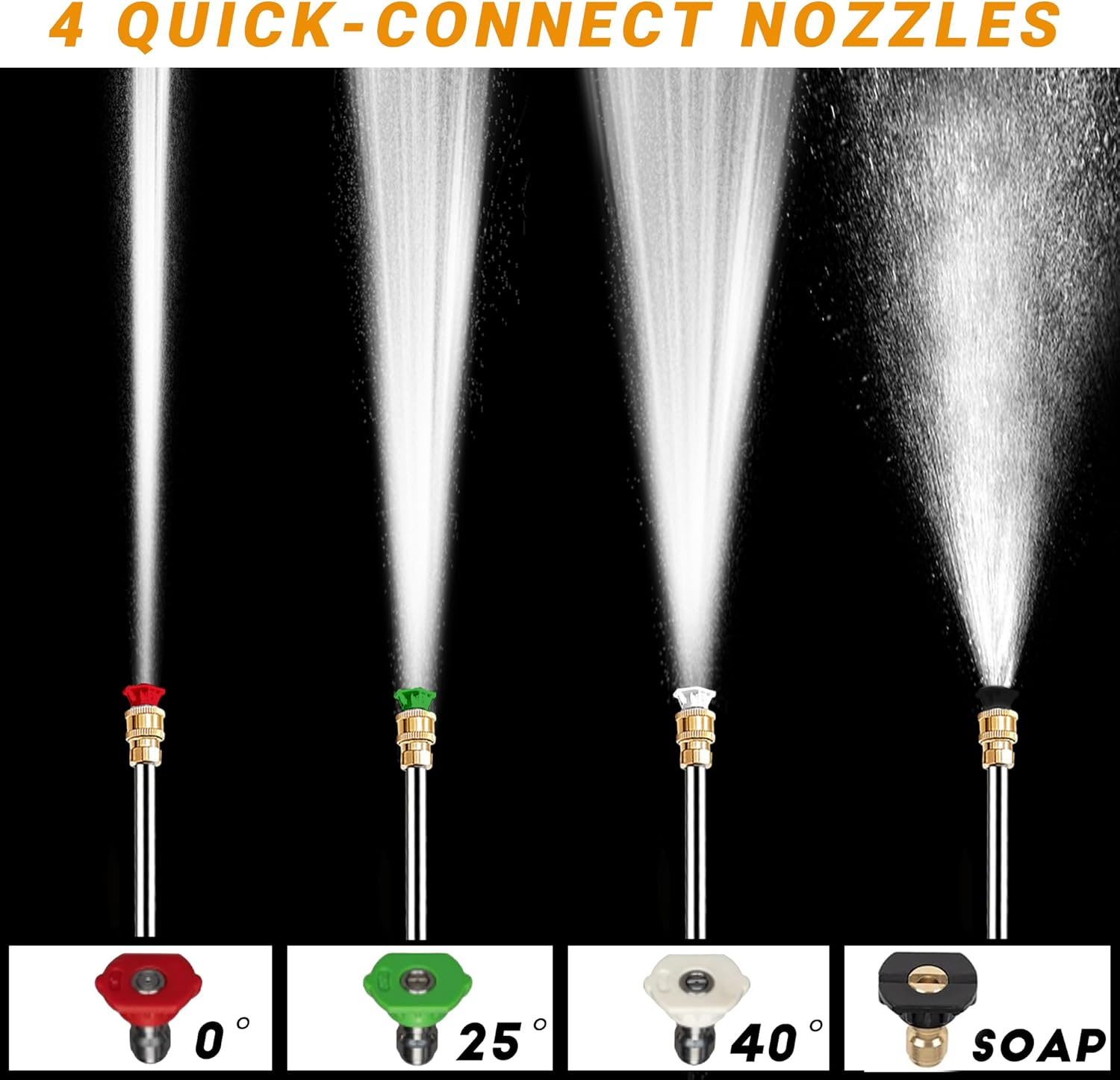 - [๐ ๐๐ฎ๐ข๐๐ค-๐๐จ๐ง๐ง๐๐๐ญ ๐๐จ๐ณ๐ณ๐ฅ๐๐ฌ - ๐๐ซ๐๐๐ข๐ฌ๐ข๐จ๐ง ๐๐ฅ๐๐๐ง๐ข๐ง๐ ๐๐จ๐ซ ๐๐ฏ๐๐ซ๐ฒ ๐๐๐ฌ๐ค ] Switch 4 quick-connect nozzles (0ยฐ, 25ยฐ, 40ยฐ, and soap) easily, each designed for specific tasks. From high-pressure jets (0ยฐ) for deep stains to a gentle 40ยฐ spray for delicate surfaces like vehiclesโthis washer covers every cleaning need with ease, for gutters, sidewalks, decks, patios, outdoor furniture, car/RV, mechanical maintenance, and home remodeling.