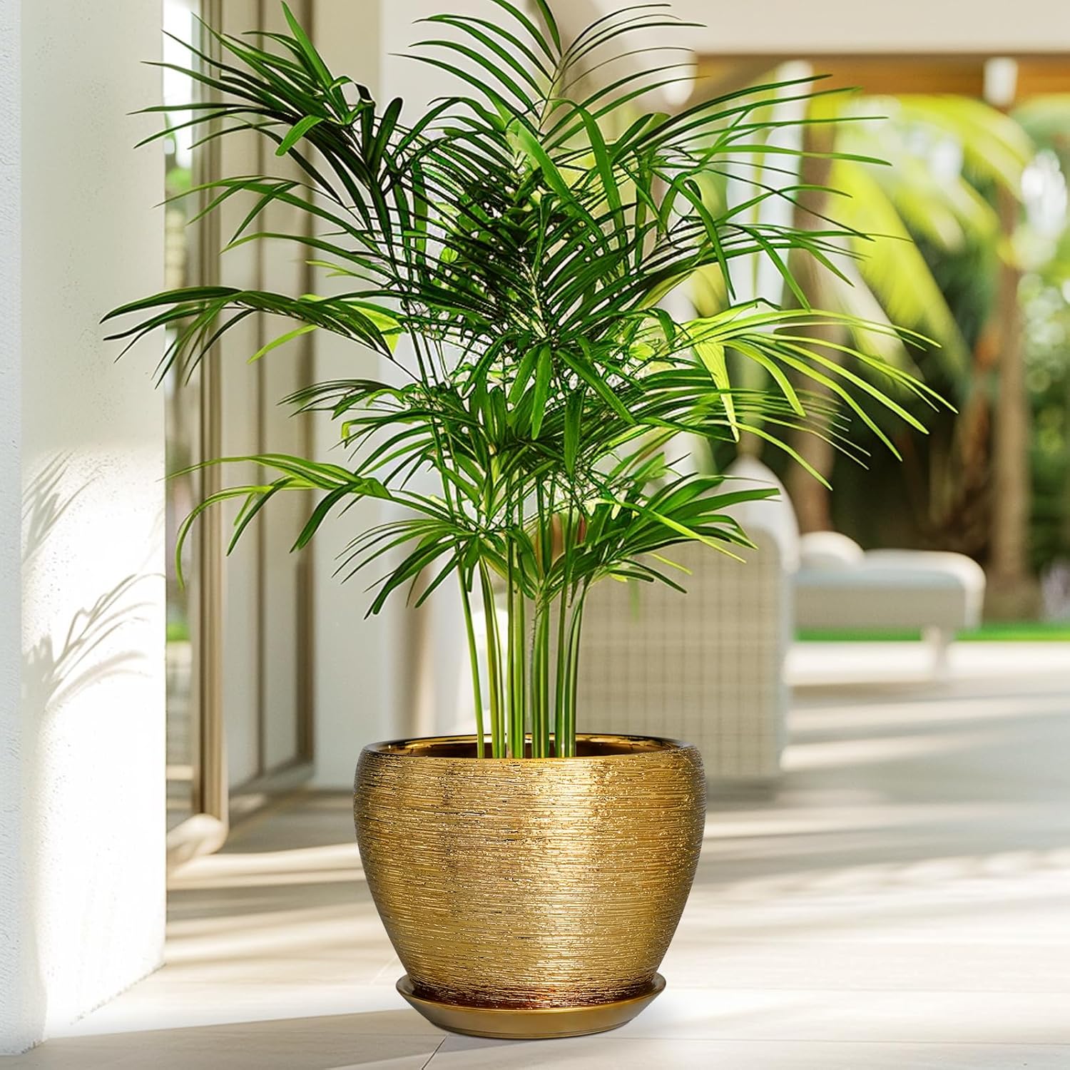 Ceramic Plant Pot 8 Inch - Planter for Outdoor Plants Indoor Plant Pot with Drainage Hole and Saucer Decorative Round Planter Modern Flower Pot for House Decor Gold