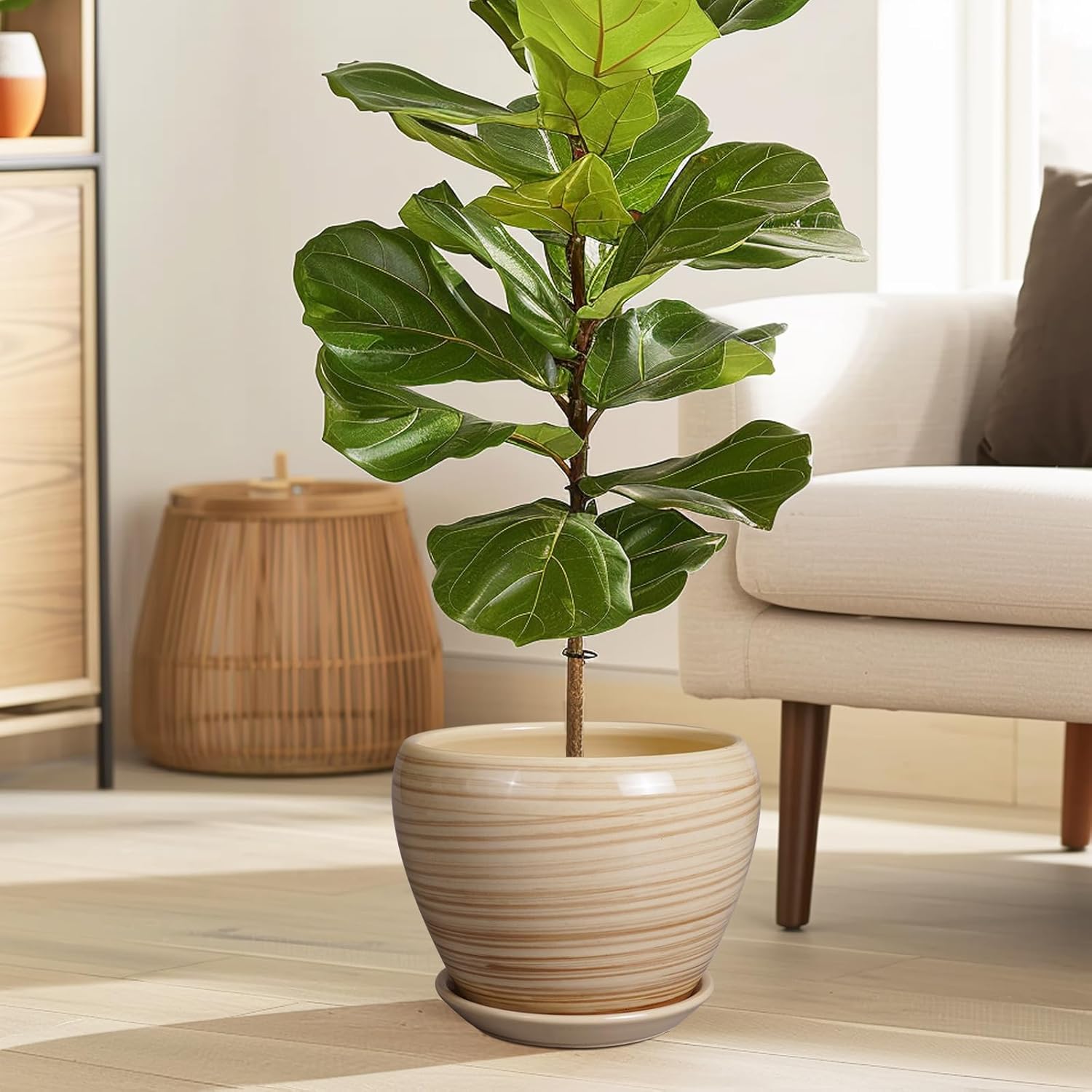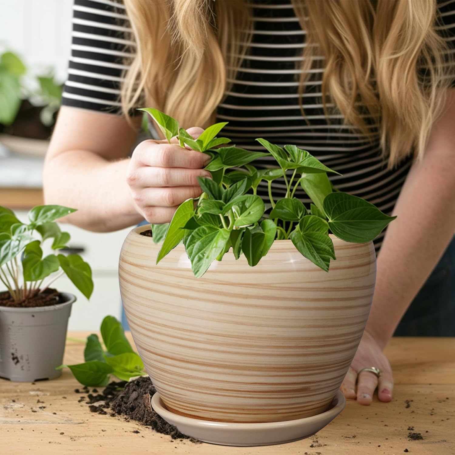 - Ceramic Plant Pot with Drainage Hole and Saucer: There is a drainage hole at the bottom of the planter for outdoor plants, which can discharge excess water and benefit the growth of plants; the lightweight ceramic tray can keep your desktop clean