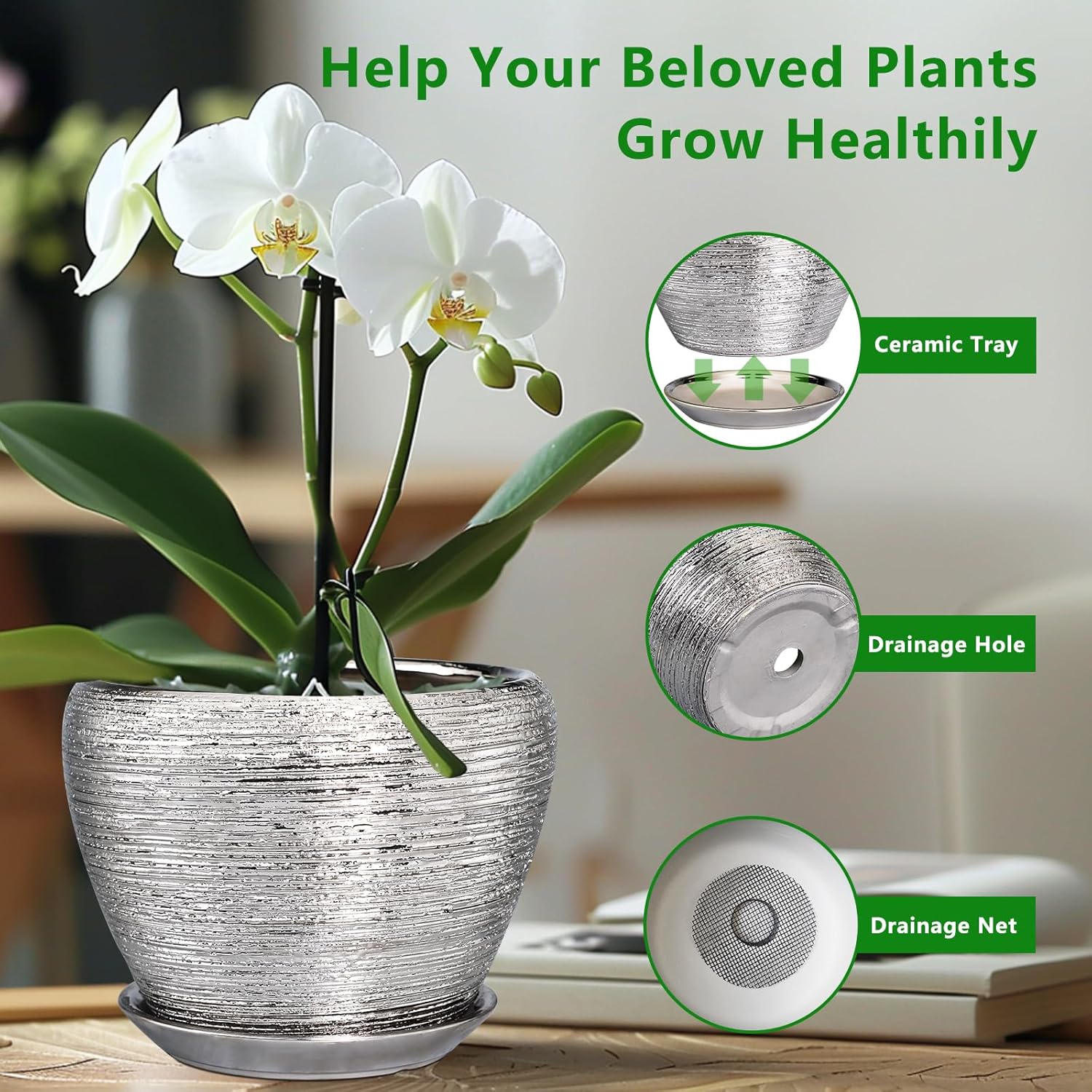Ceramic Planter - 6 Inch Plant Pot Indoor with Drainage Hole and Saucer Outdoor Pot for Plants Round Decorative Planter Modern Mid-Century Flower Pot for Office Decor Silver