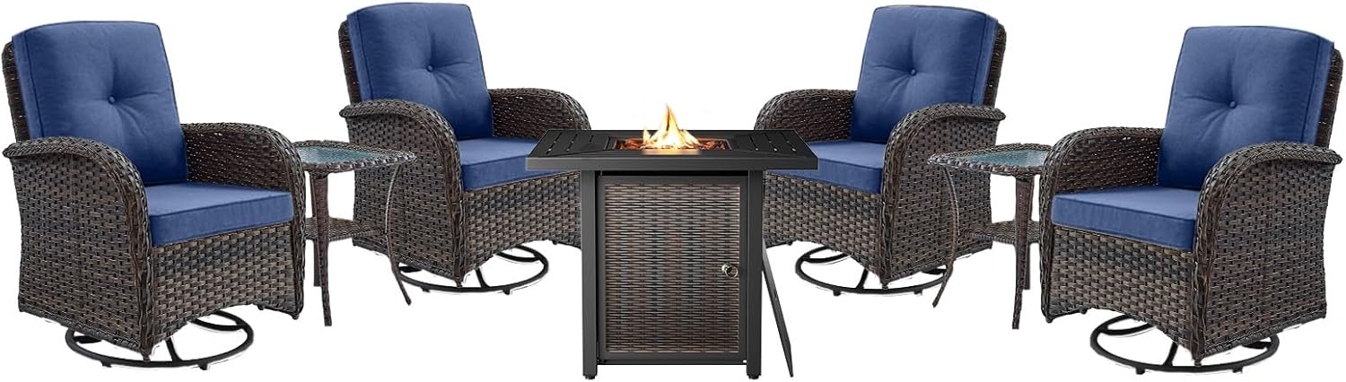 - Ultimate Outdoor Patio Comfort: This 7-piece outdoor patio furniture set, featuring 4 swivel rocker chairs, 2 side tables, and a 30-inch 50,000 BTU propane fire pit table, brings the ultimate comfort and style to your patio. Perfect for any outdoor setting, this outdoor patio conversation set elevates your outdoor experience, creating a cozy spot for relaxation and socializing.