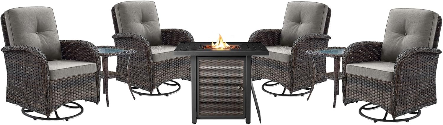 - Ultimate Outdoor Patio Comfort: This 7-piece outdoor patio furniture set, featuring 4 swivel rocker chairs, 2 side tables, and a 30-inch 50,000 BTU propane fire pit table, brings the ultimate comfort and style to your patio. Perfect for any outdoor setting, this outdoor patio conversation set elevates your outdoor experience, creating a cozy spot for relaxation and socializing.