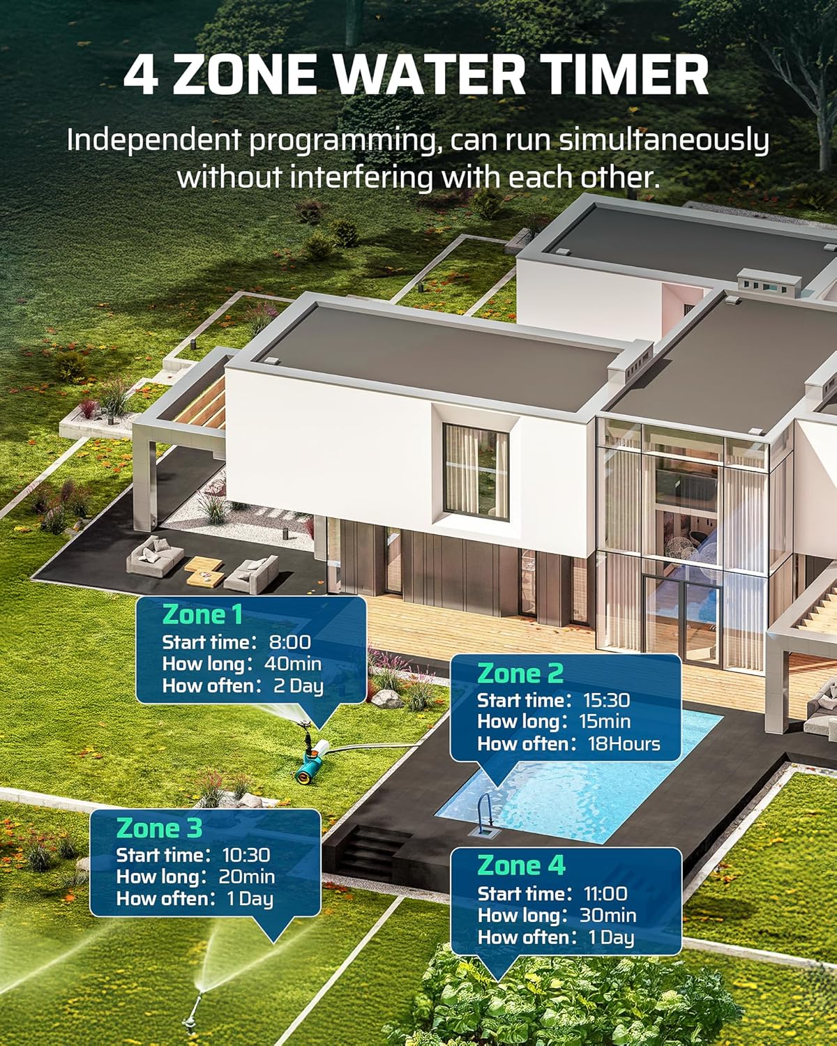 - [Four Independent Outputs] Control up to four separate zones, with the ability to set up to 16 unique programs; each zone allows you to customize the start time, watering duration (1-360 mins), and watering frequency (1 min to 15 days); ideal for precise irrigation needs in gardens, lawns, and landscaped areas