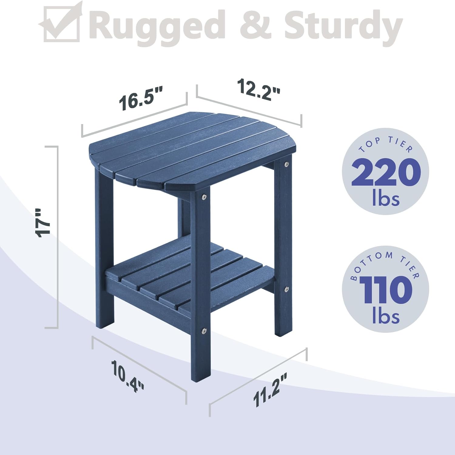- ă2-Tier Storage Space & Smooth SurfaceăThe design of 2-tier makes the outdoor side table have more space to store items such as food, drink, books and flowers. The upper layer can hold 210 lbs, and the lower layer 110 lbs. The outdoor table also has a smooth surface and smooth edges, free of burrs to prevent puncturing or scratching the skin.