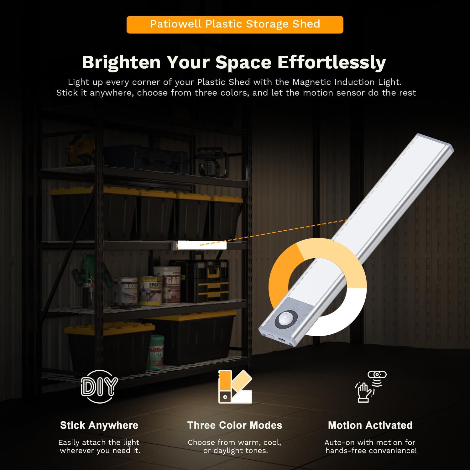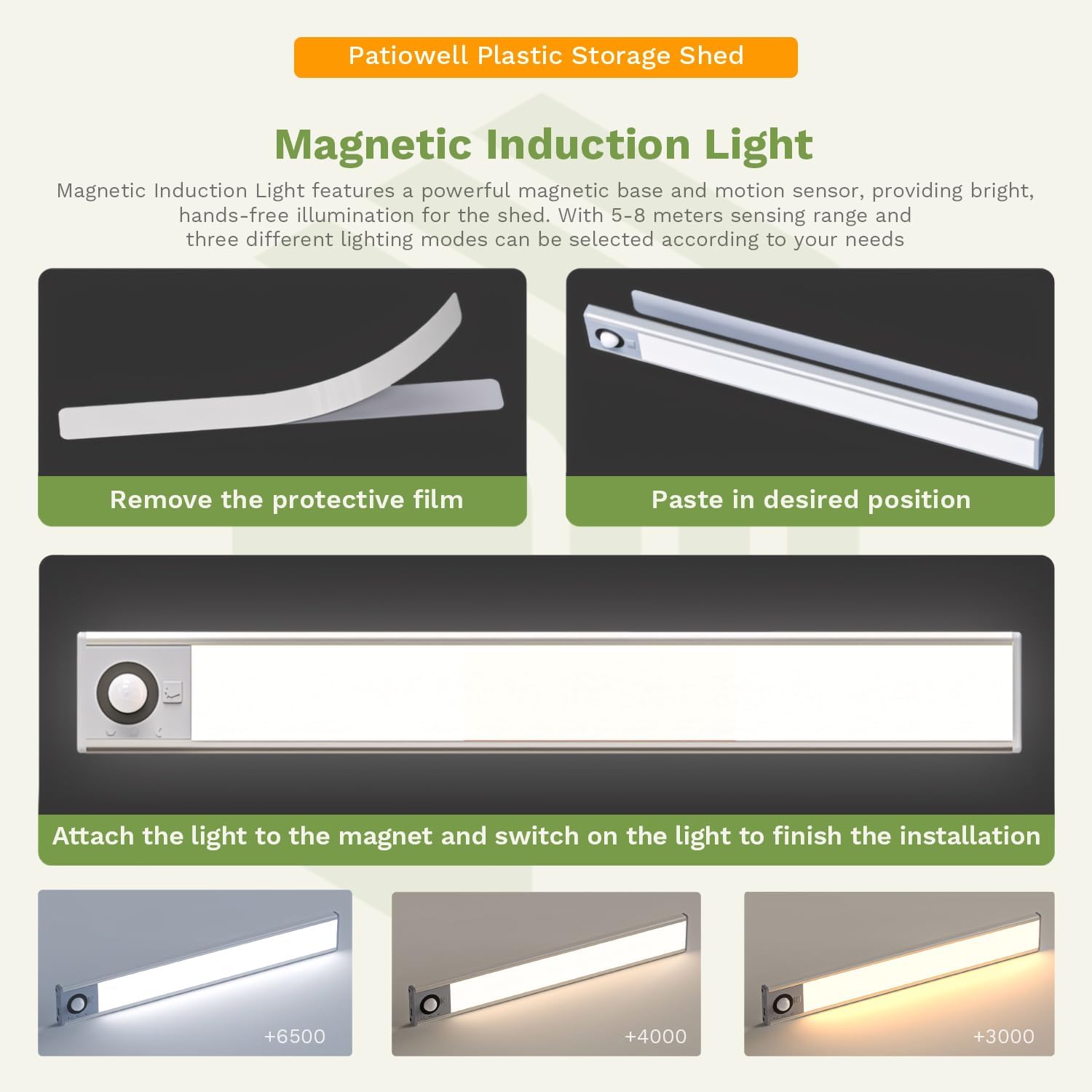 - Magnetic Induction Light: Magnetic Induction Light features a powerful magnetic base and motion sensor, providing bright, hands-free illumination for the shed. With 5-8 meters sensing range and three different lighting modes can be selected according to your needs