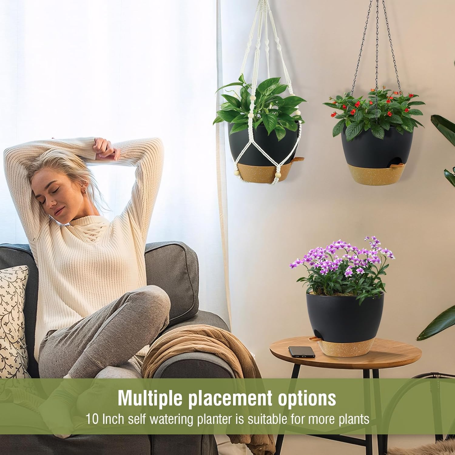 - 【Convenient】Self watering hanging pots with deep reservoir makes it easy for when go on vocation that no need someone to come over water plants and flowers. and these hanging baskets are easy to install and suitable for hanging in various locations such as balcony, window, porch and garden.