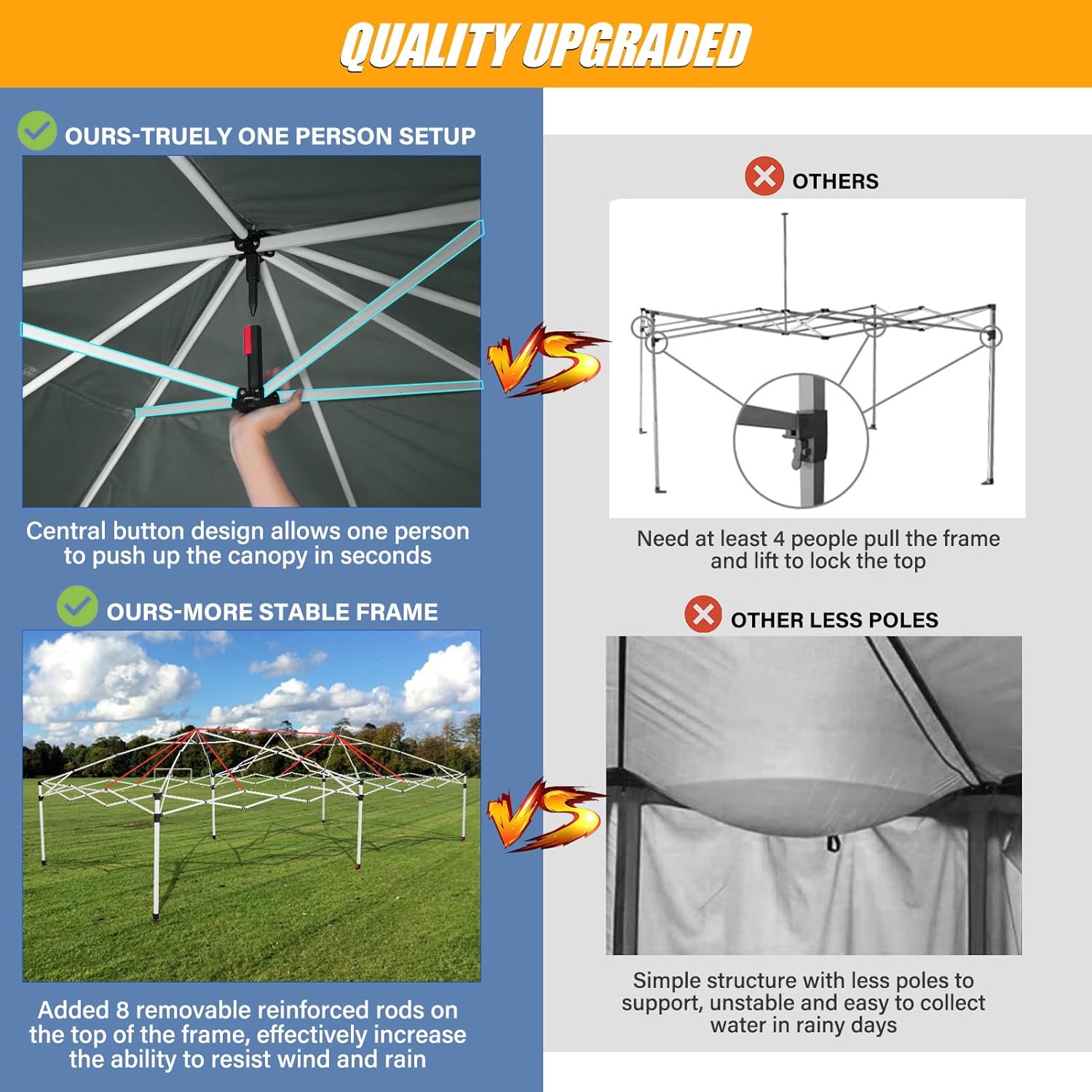 - OPTIMIZED FOR STABILITY: Our canopy tent with sidewalls is crafted from durable powder-coated steel pipes and equipped with 8 detachable poles for exceptional top support. Easy up canopy remains steady even in windy and rainy conditions.