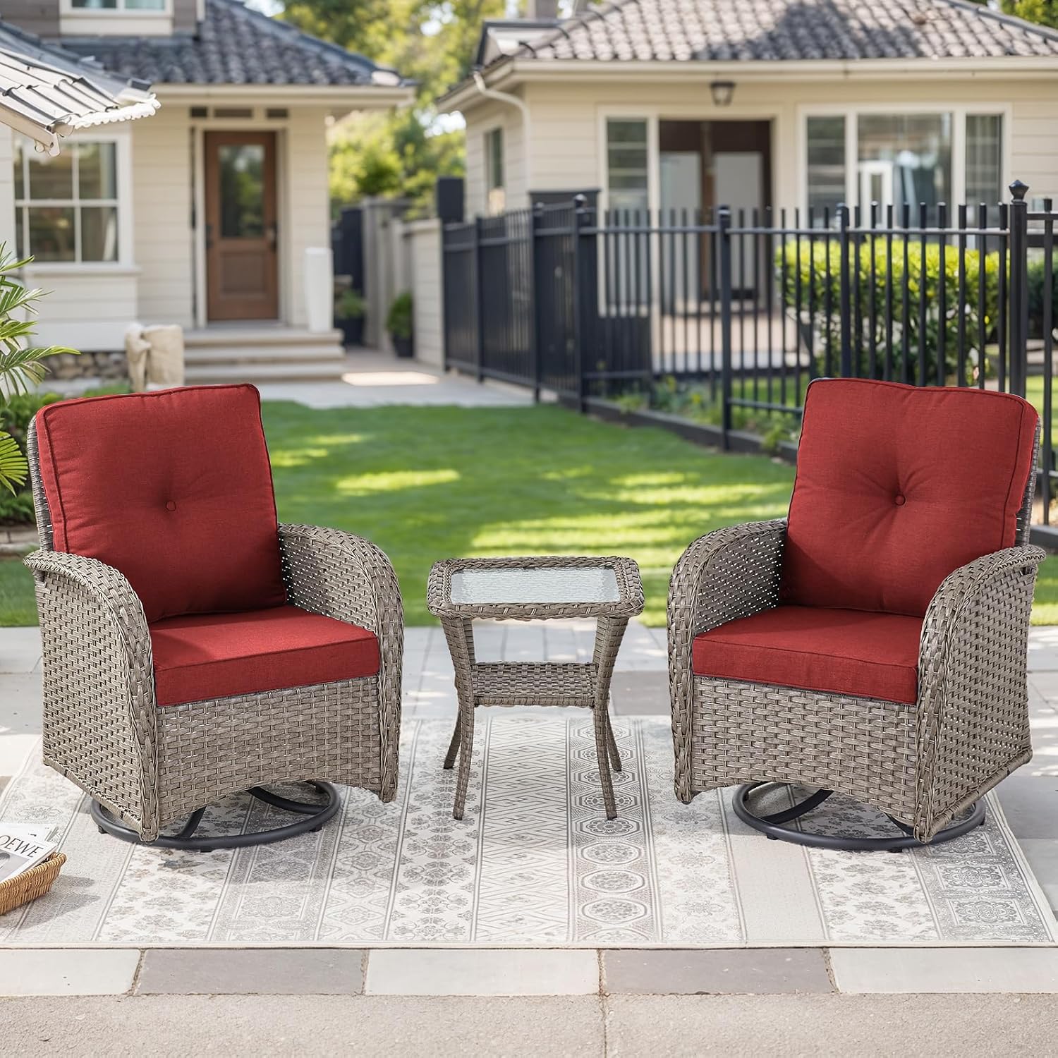 - 360-Degree & Glider Swivel Patio Chairs: Relax in comfort with these outdoor swivel chairs that feature 360-degree rotation for easy movement. The ergonomic seat and backrest provide excellent support for long outdoor sessions. Enjoy a smooth back-and-forth glider motion, while the 3-inch armrests offer added comfort for your arms. Perfect for unwinding or socializing, these chairs enhance your outdoor experience with both comfort