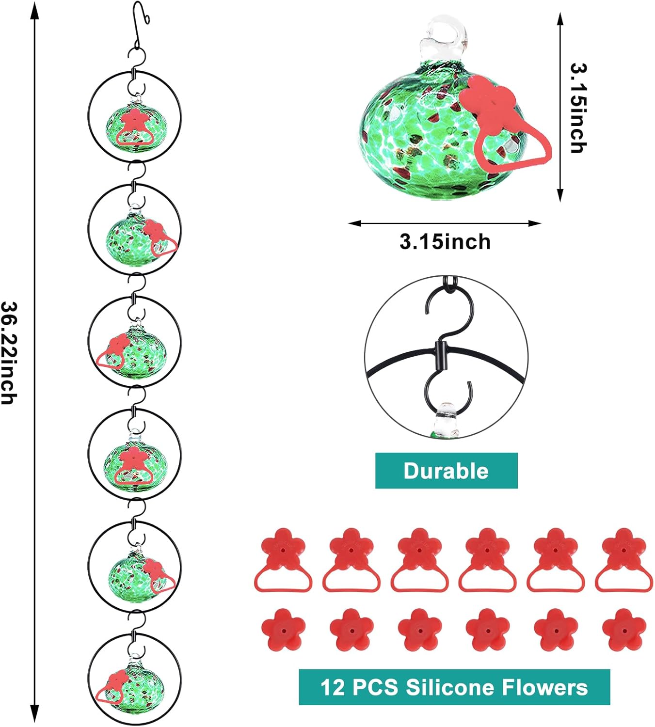 Flexible 6 Pack Hummingbird feeders for Outdoors Hanging Ant and Bee Proof,Detachable Hand Blown Glass Hummingbird Feeder with 6 Adjustable Silicone Perch(Green)
