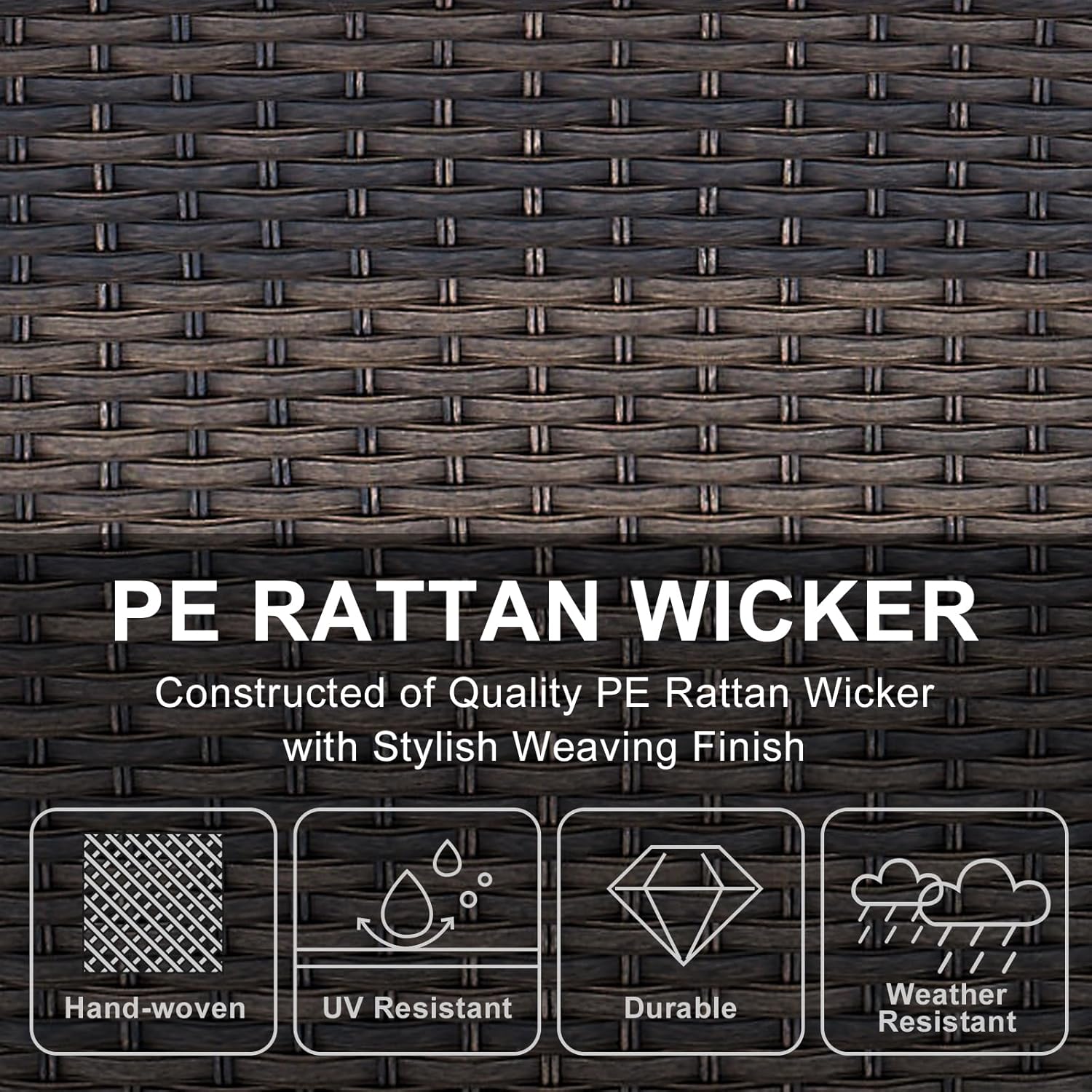 - Durable and Sturdy: Crafted with a powder-coated steel frame, these weather-resistant UV protection pieces are wrapped in hand-woven PE wicker to make this outdoor furniture set durable and sturdy. The steel frame max weight capacity is 250 lbs.