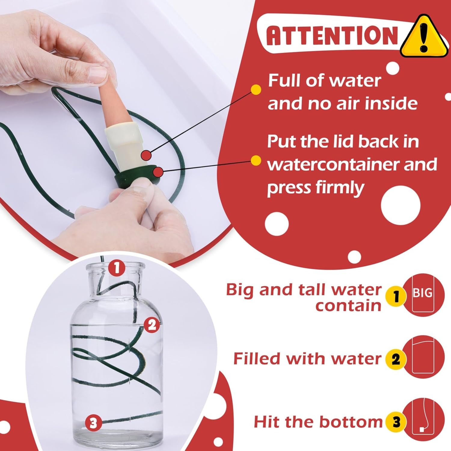 - 🌳SELF WATERING PLANTERS INSERT: Save your time and your plants.Soak the clay cone at least 15mins,put the lid back in water container and press firmly. Create a vacuum environment by ensuring the green pipe is full of water and no air inside,put the hose into the container and insert this stake into the soil,it’s started to work for your plants. Set up easily.