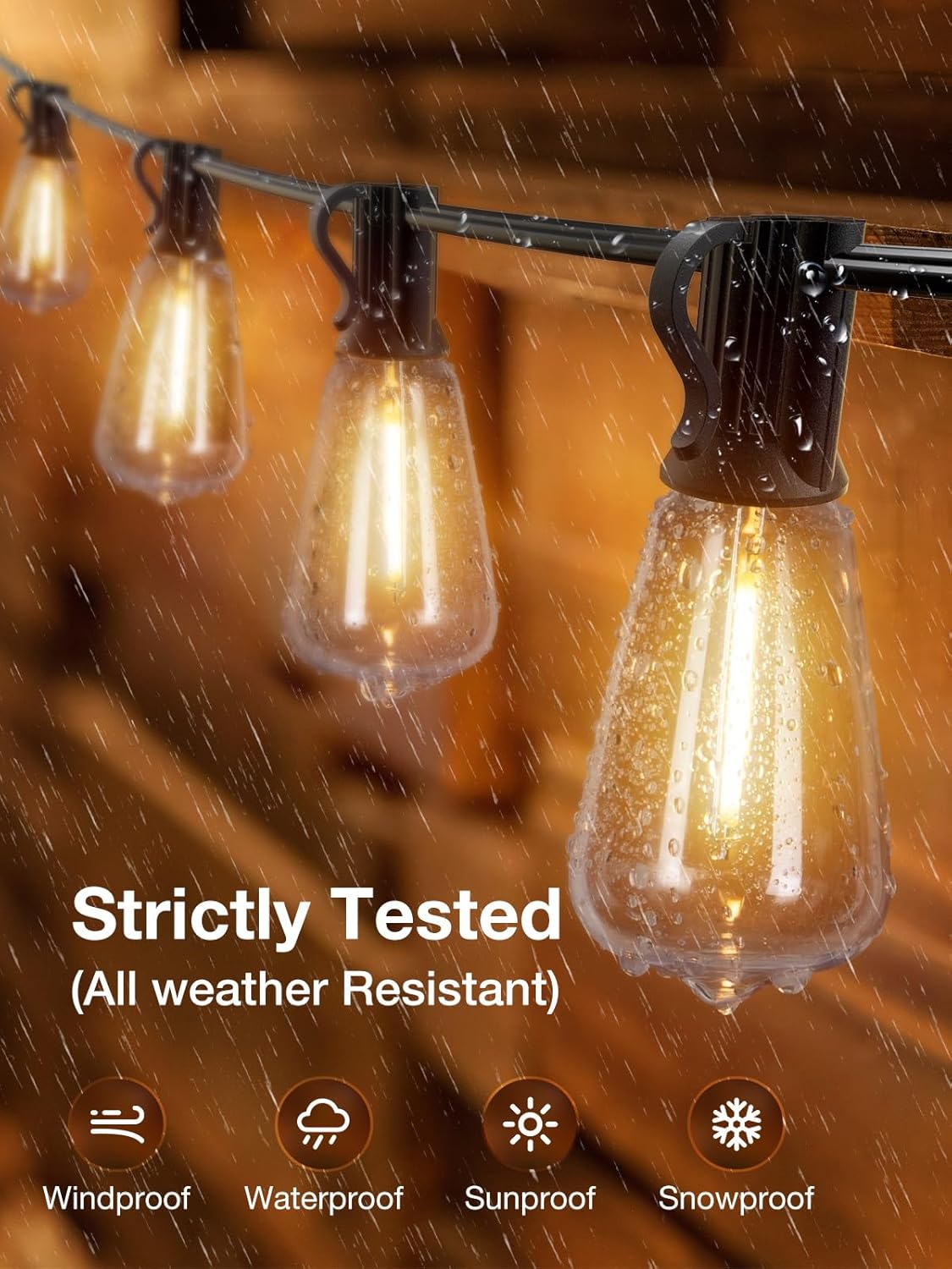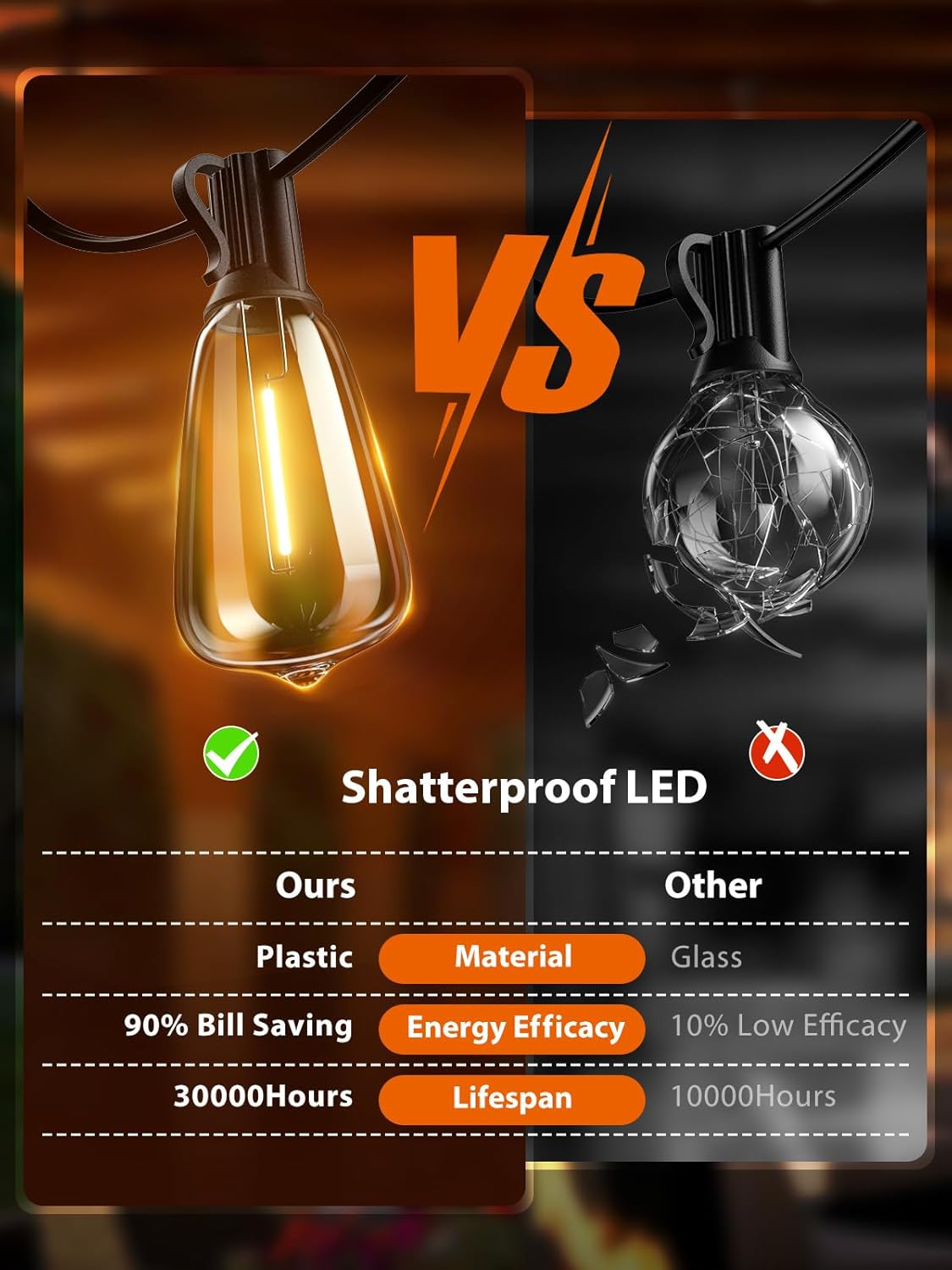 - 【Weatherproof and Shatterproof】IP65 Waterproof led string lights can withstand cloudy, damp, windy, foggy, rainy, snowy, or extreme temperatures,This making it ideal for year-round use in outdoor spaces like patios, gardens, and bistros, creating a festive and inviting atmosphere.Besides, these led bulbs made from unbreakable PET material and hard anti-drop plastic shells,This ensures the safety of your family, as there is no risk of broken glass shards while hanging these backyard lights
