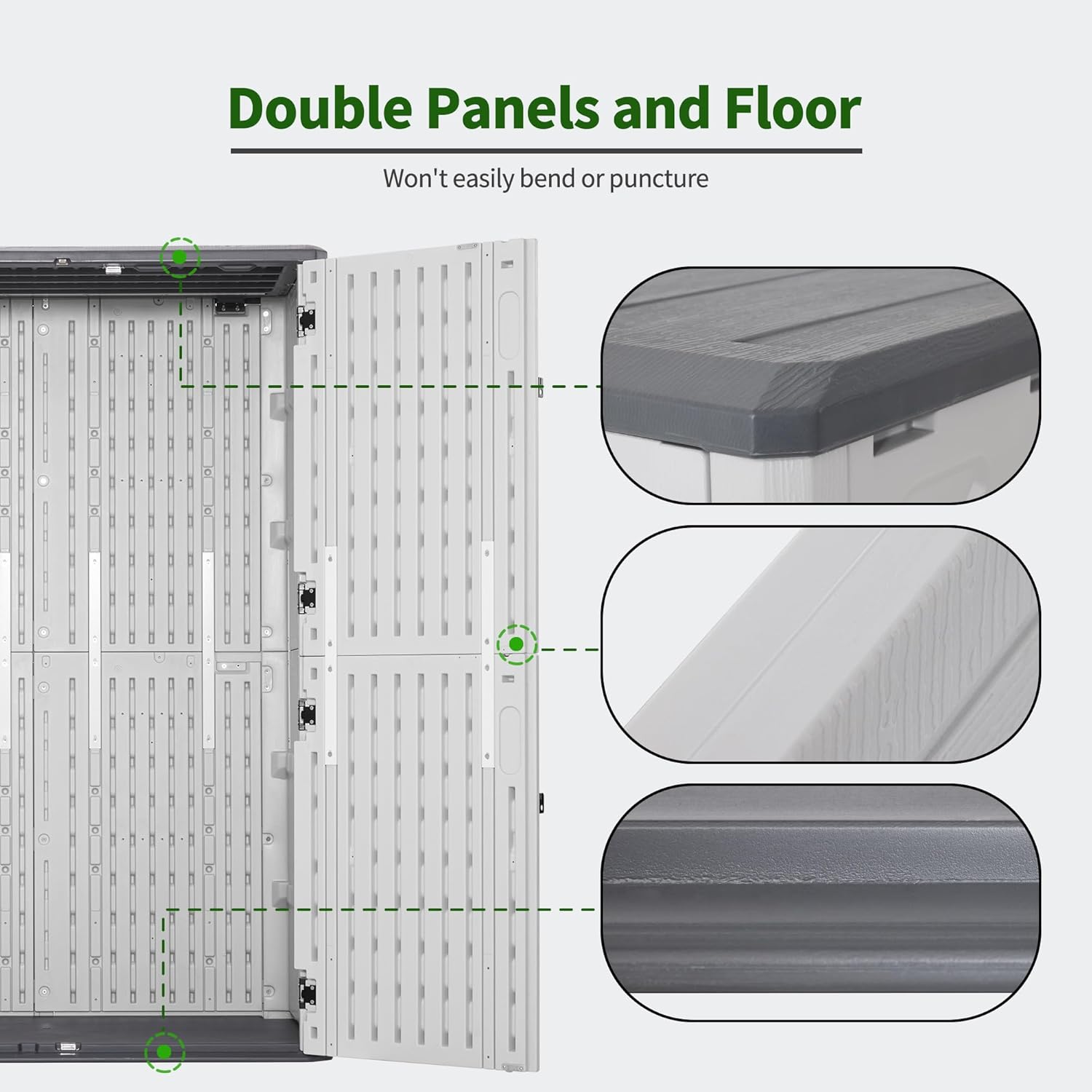 - Double Panels: The shed outdoor storage features double panels that won't easily bend or puncture
