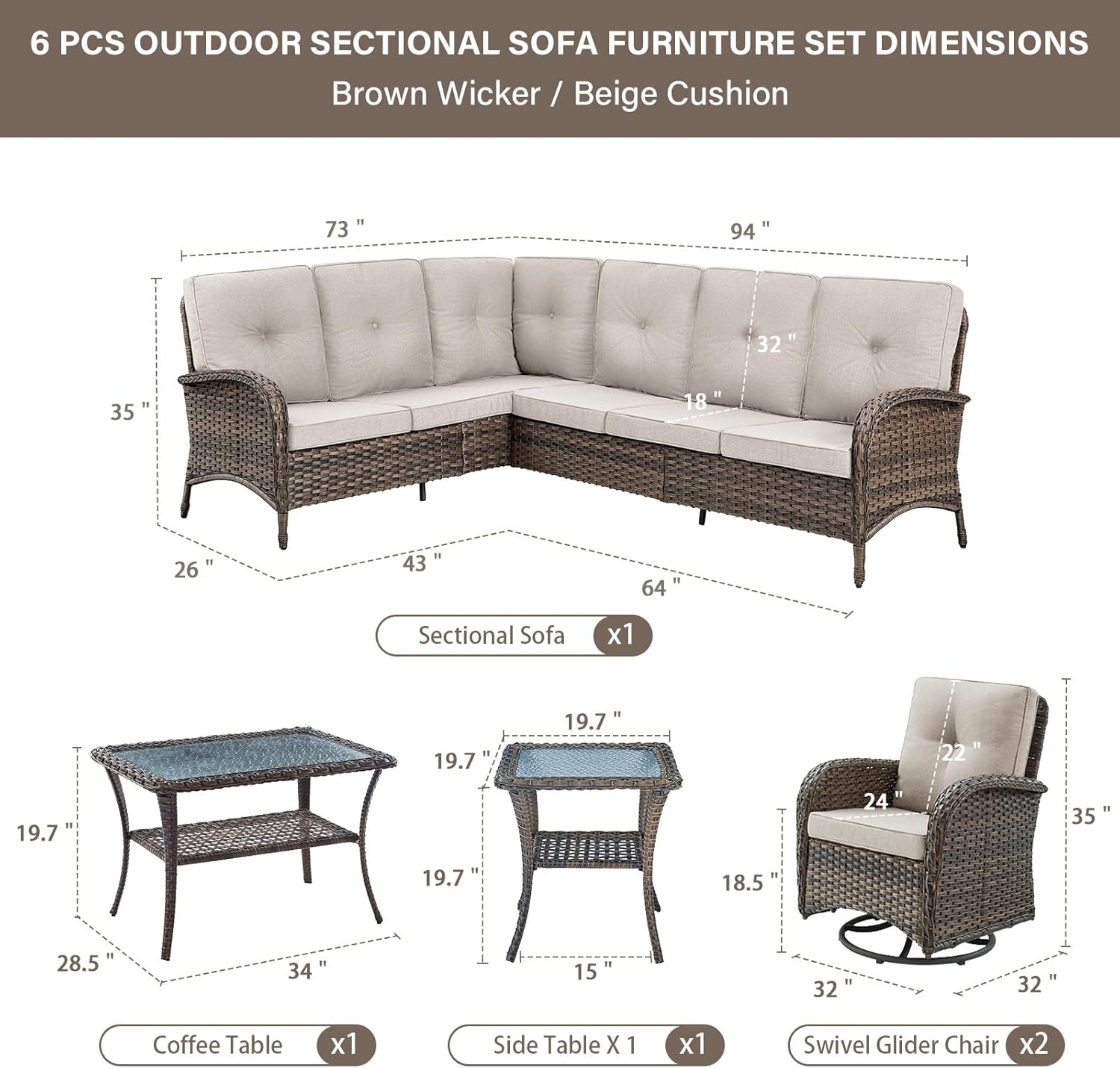 - Size : 6 PCS - Sectional Sofa & Swivel Glider