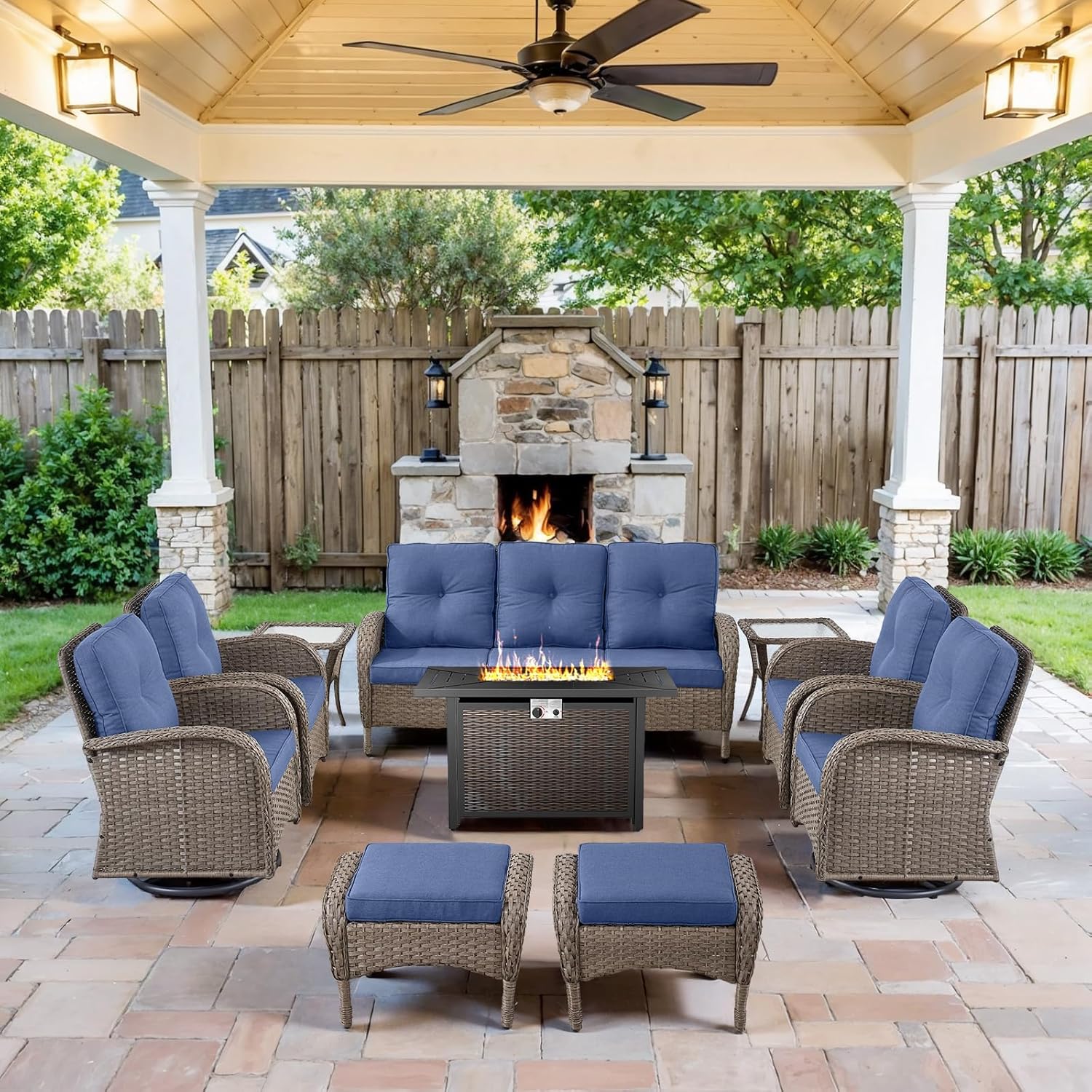 - Complete Patio Furniture Set Details:Transform your backyard into a luxurious retreat with Belord 10-piece outdoor patio furniture set with fire pit table. Featuring a spacious 3 seater sofa, four swivel rocker chairs, two versatile ottomans, two side tables, and a 43-inch fire pit table, this patio furniture set is perfect for hosting unforgettable outdoor gatherings or relaxing evenings.