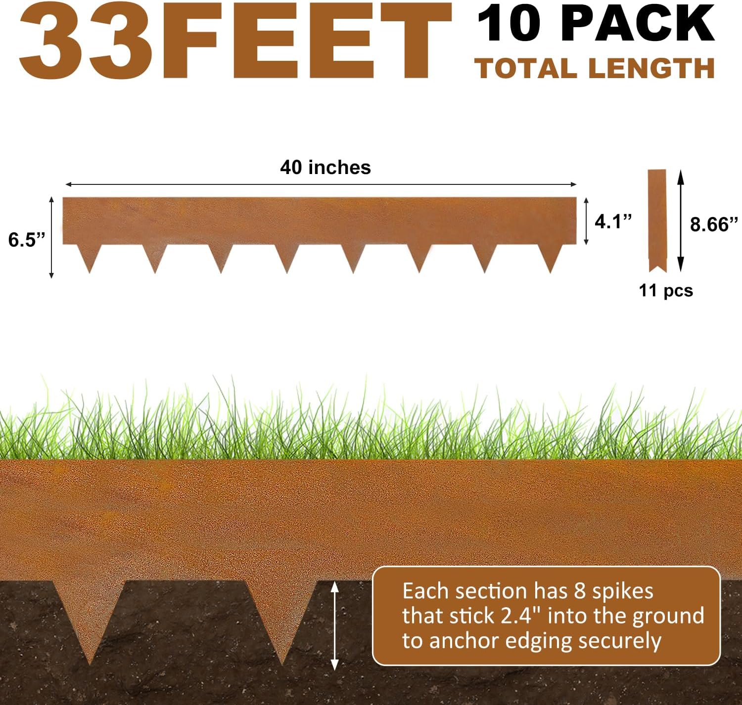 - Package Included: This landscape edging kit includes 10 pieces, each 40 inches long, totaling 33 feet when installed. It comes with 11 pieces of 8.66” clamps to ensure secure connections between edgings. Standing 6.5 inches tall with 4.1 inches above ground, it’s ideal for defining lawns, flower beds, gardens, pathways, and yard borders