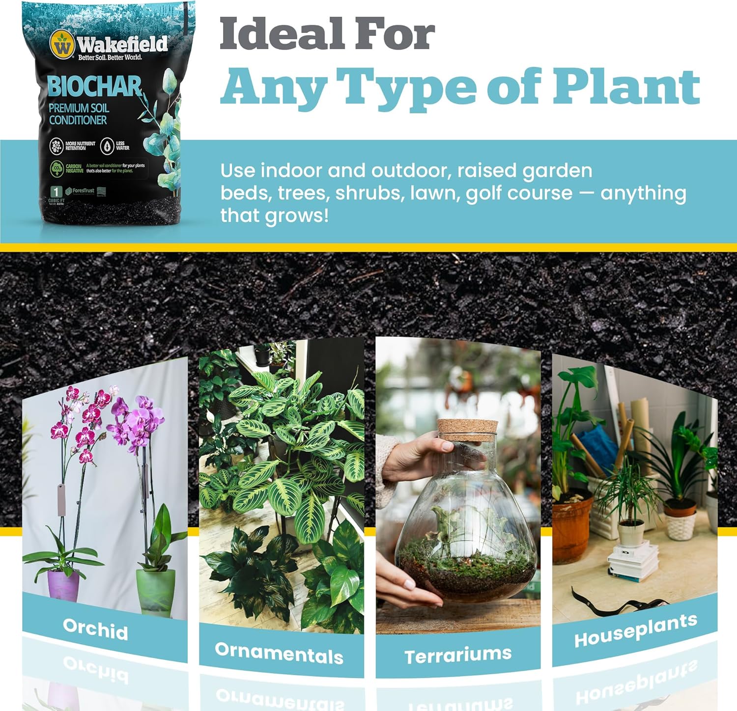 - Universal Compatibility & Ease of Use: Wakefield Biochar integrates seamlessly with potting soil, compost, granular fertilizers or directly into garden beds. Simply mix at a 10–20% ratio for containers or spread evenly across raised beds and lightly incorporate with a rake. Ideal for indoor houseplants, vegetable patches, flower gardens and expansive lawns, experience unmatched versatility across every soil type and gardening style.