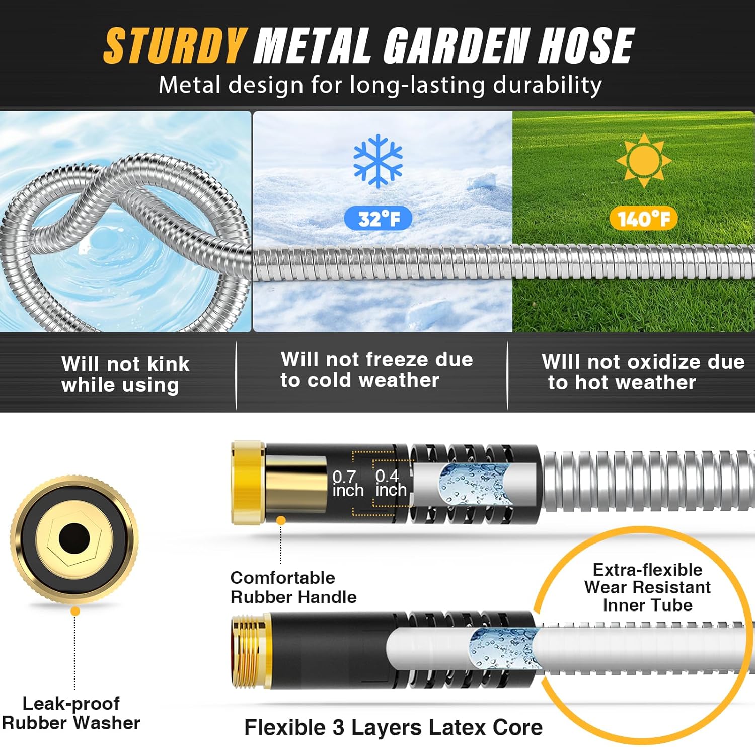 - 【Upgraded Design & Superior Durability】- Long-lasting garden hose 50ft, made of 304 stainless steel, works well in extreme temps, outperforming rubber hoses. Its upgraded rubber handle offers great flexibility and wear resistance, addressing the common issue of water leakage at the hadle to save water. The hose resists punctures and pet bites, and has a long service life.