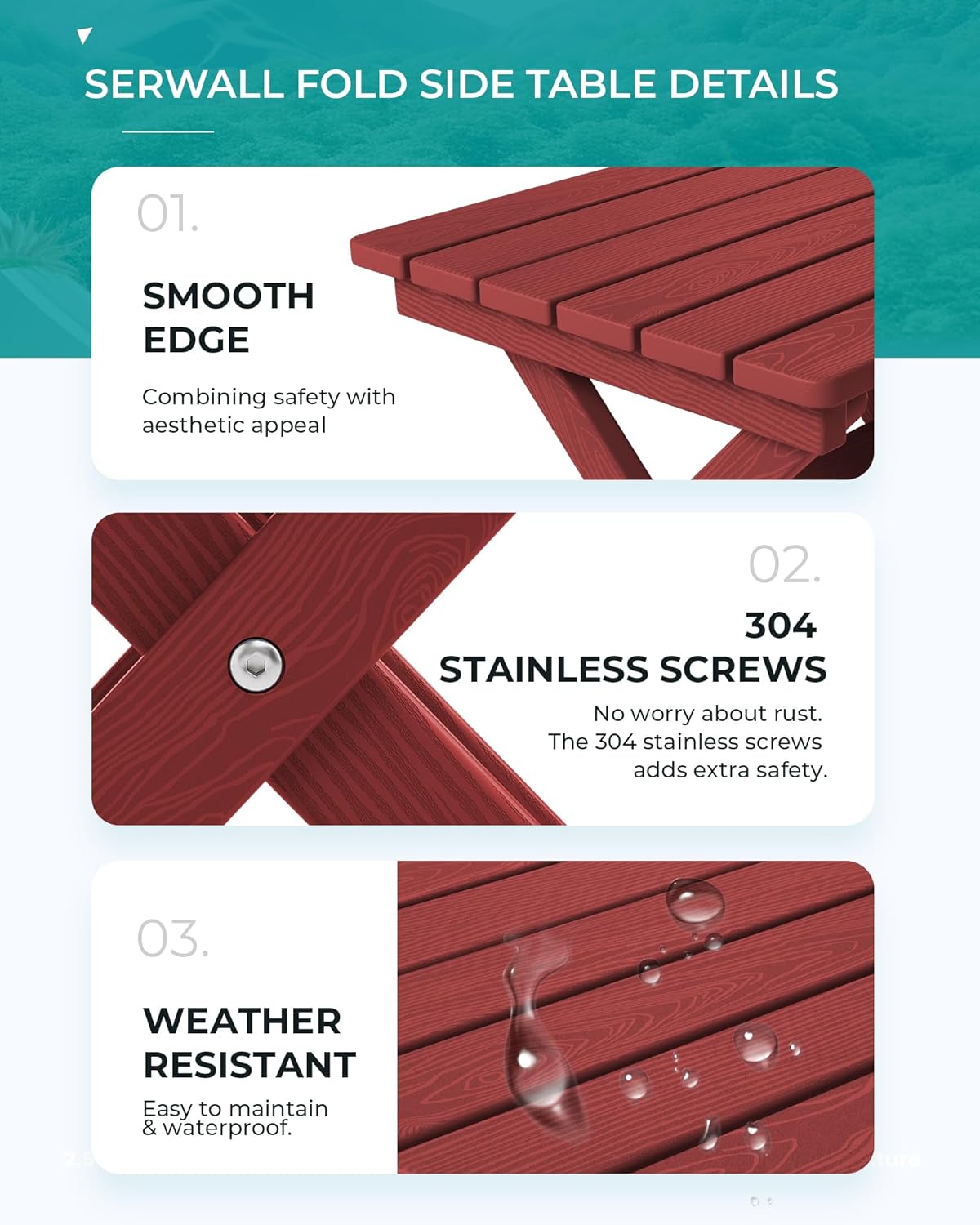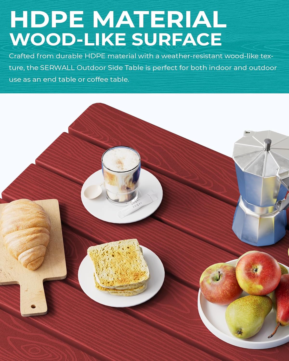 - [Premium Wood-Textured Surface] Offering the aesthetic appeal of wood without the upkeep, the SERWALL Side Table features a wood-textured HDPE surface that adds an elegant and natural touch to your outdoor decor.