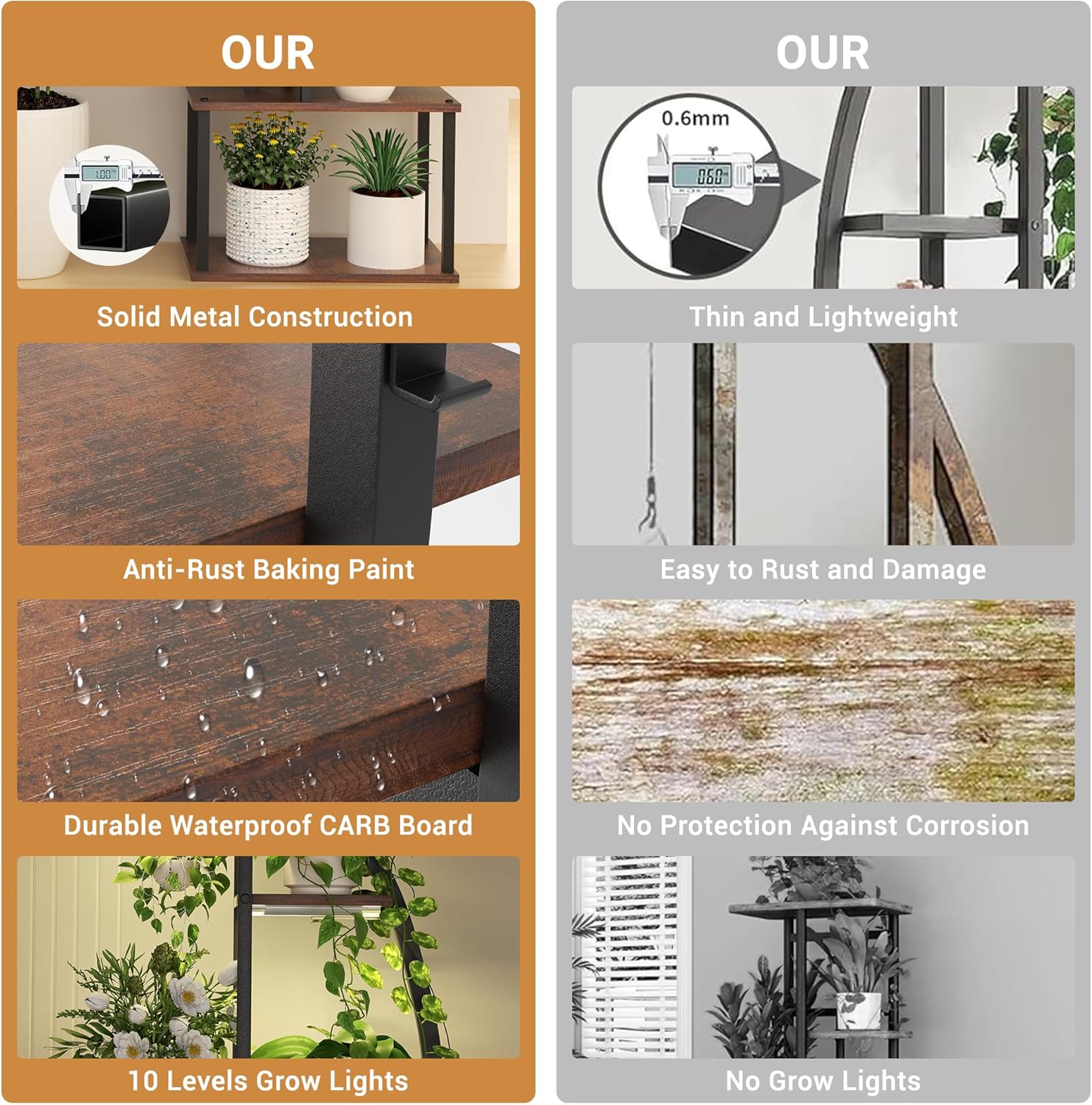 - 【Stable and Sturdy】 The plant stand is made of hard rust-proof iron pipe with a sturdy structure, coated with baked enamel to avoid rust. The particle board surface is coated with a waterproof layer. The surface is smooth and burr-free to avoid corrosion, warping, and curling, and it's easy to maintain and wipe down for long-lasting durability.