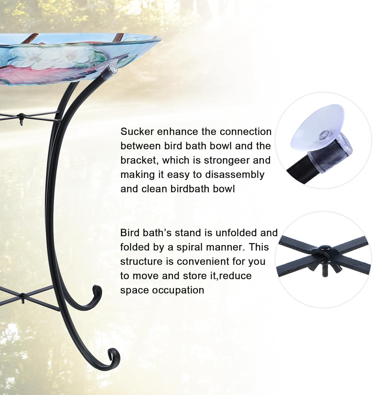 - Bird bath is made of glass and stainless steel, easy to assemble and clean. Adding foldable free metal standing, which can be easy to move or storage this large glass bird bath
