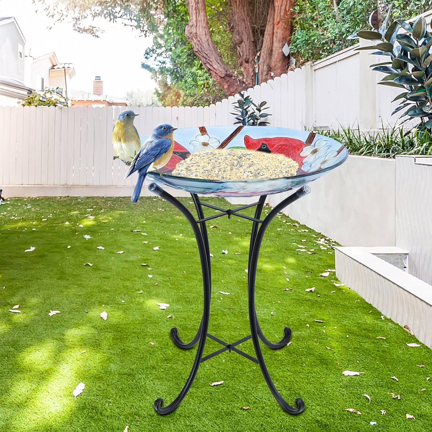 MUMTOP Outdoor Glass Birdbath with Metal Stand for Outside Yard Garden Decor, 18 inch Diameter Red Caridnals Bird Baths Bowl for Outdoors, 21.65 inch Height