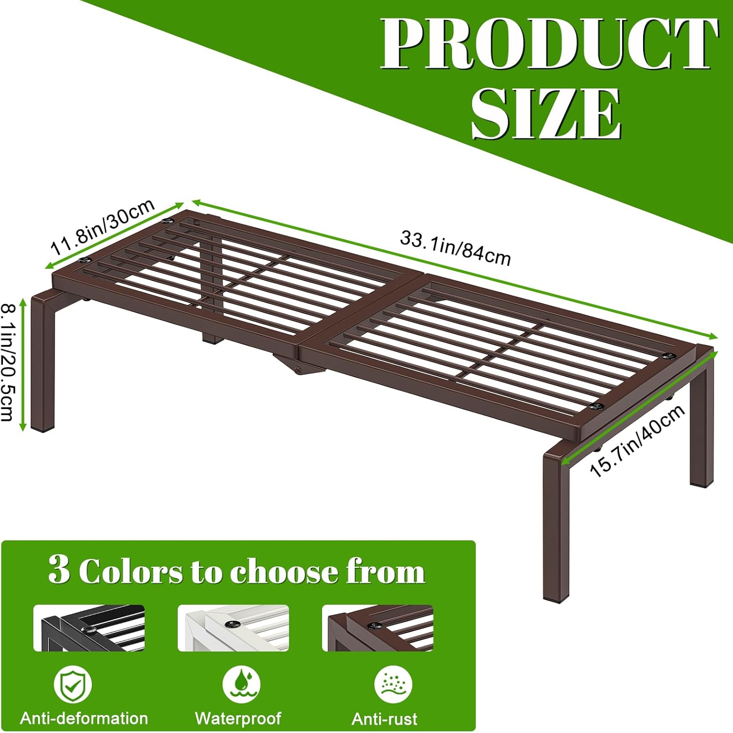 - Product Dimension: The metal plant shelf measures 31.1" L x 11.8" W x 8.1" H, with its sturdy grid and reinforced construction ensuring pots of all sizes stay securely in place.