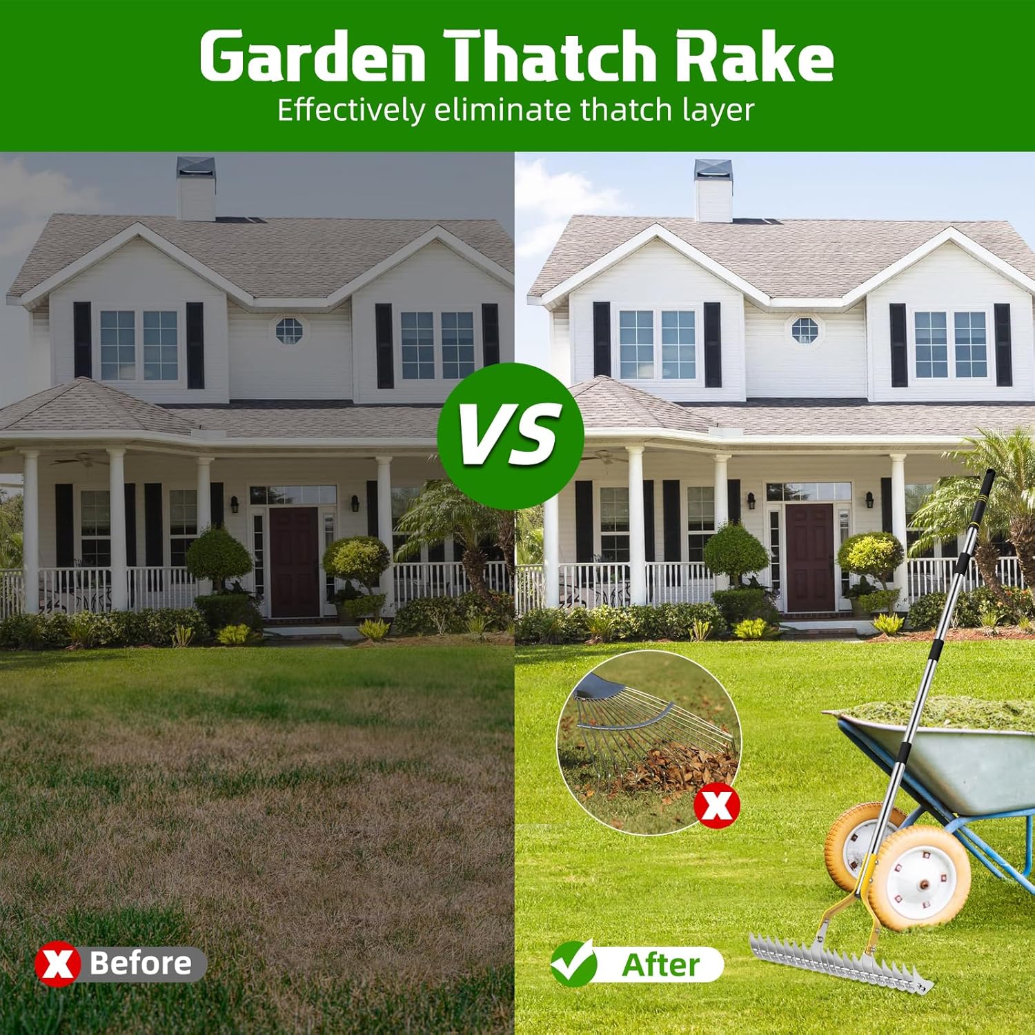 - Efficiently Remove Thatch: The Trydream Thatch Rake is specially designed to effectively eliminate thatch layers, allowing your lawn to breathe and absorb sunlight more efficiently. It also helps in clearing fallen leaves and debris, keeping your lawn tidy and promoting healthy growth