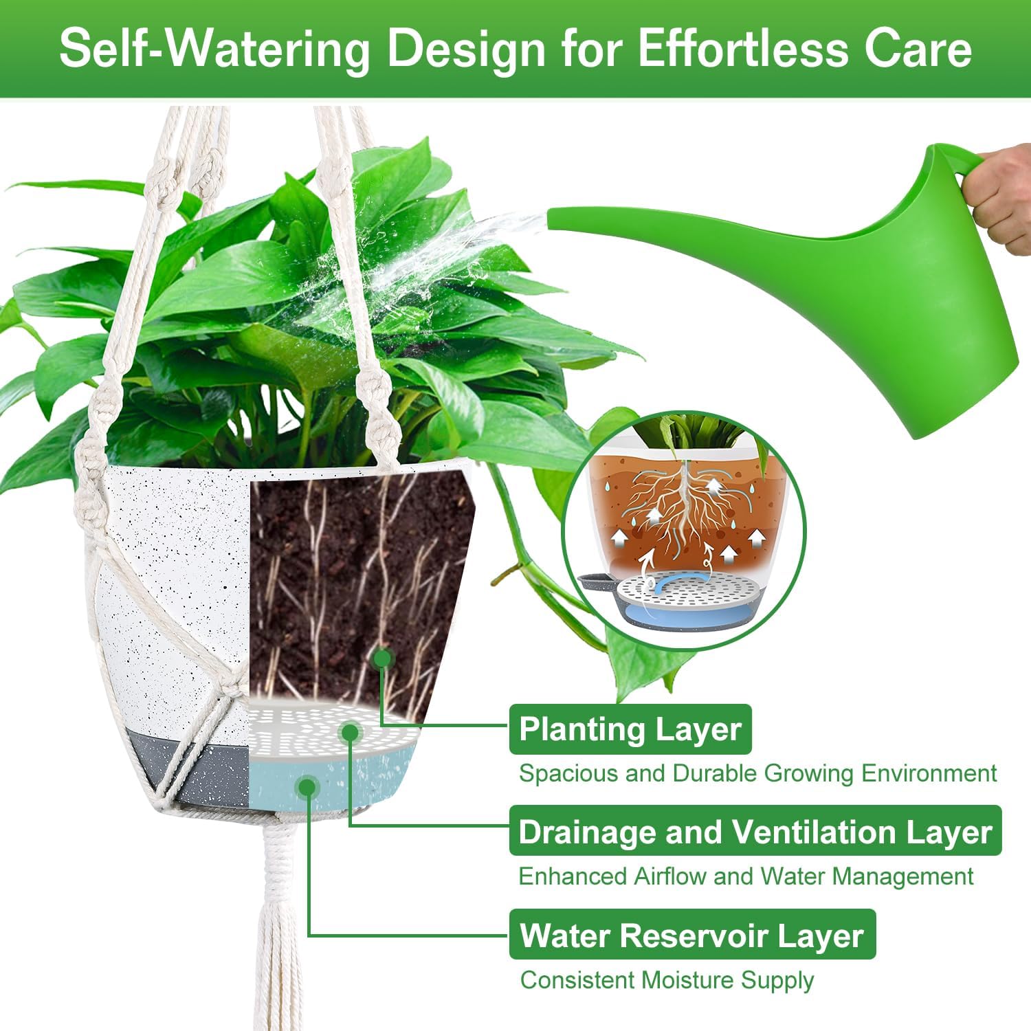 - 【Self-Watering Hanging Planters with Detachable Saucer】The recessed buckle rotating design under each hanging indoor planter maintains optimal water levels for your plants,Absorbent cotton ropes automatically deliver moisture to soil when needed, Spend less time watering hanging baskets for indoor plants without worrying about the plants drying out when you are out for business or travel.
