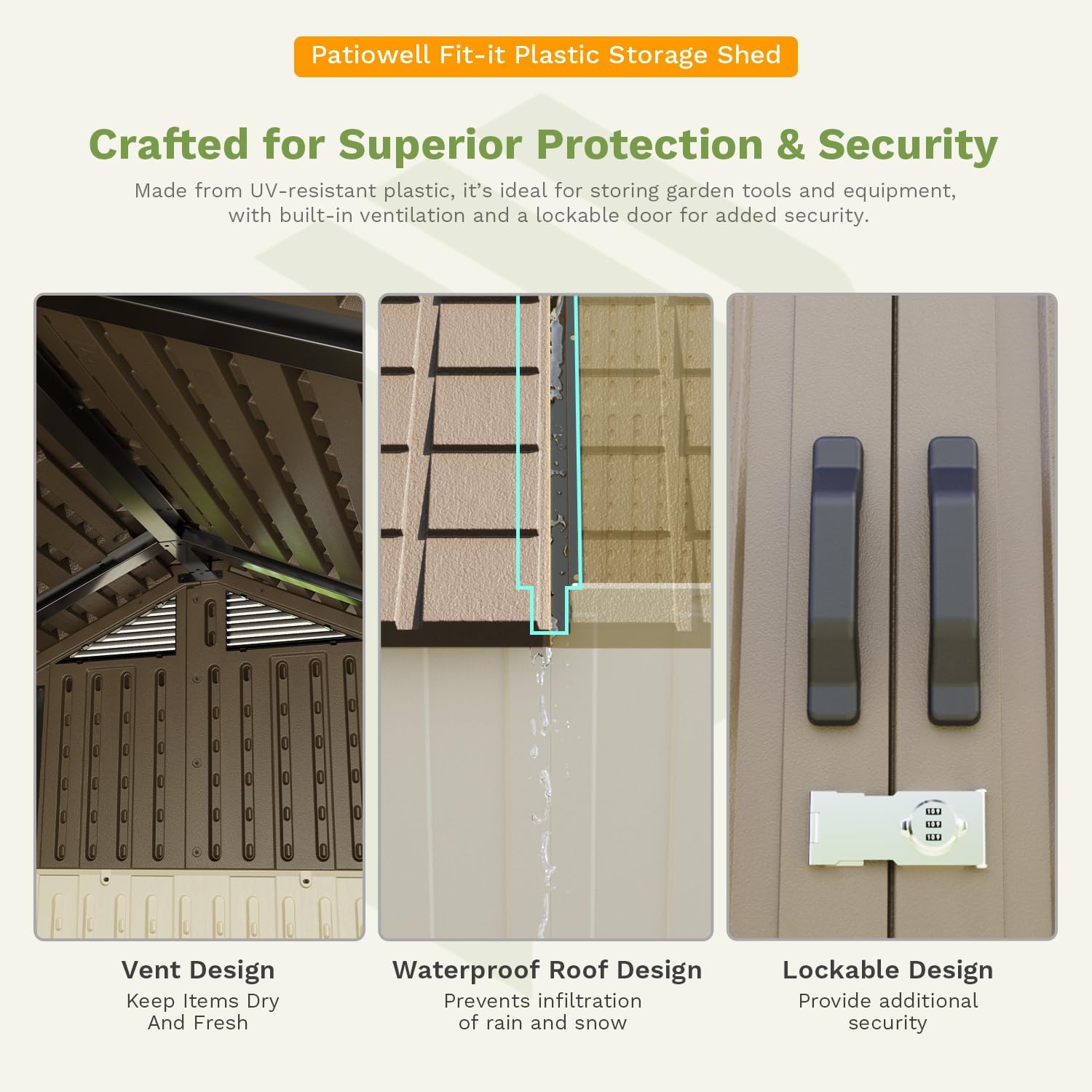 - Recyclable And Durable Material: Made from recyclable materials, this storage shed is designed to be both lightweight and durable. Beige wall and gray roof are more beautiful and fashionable.