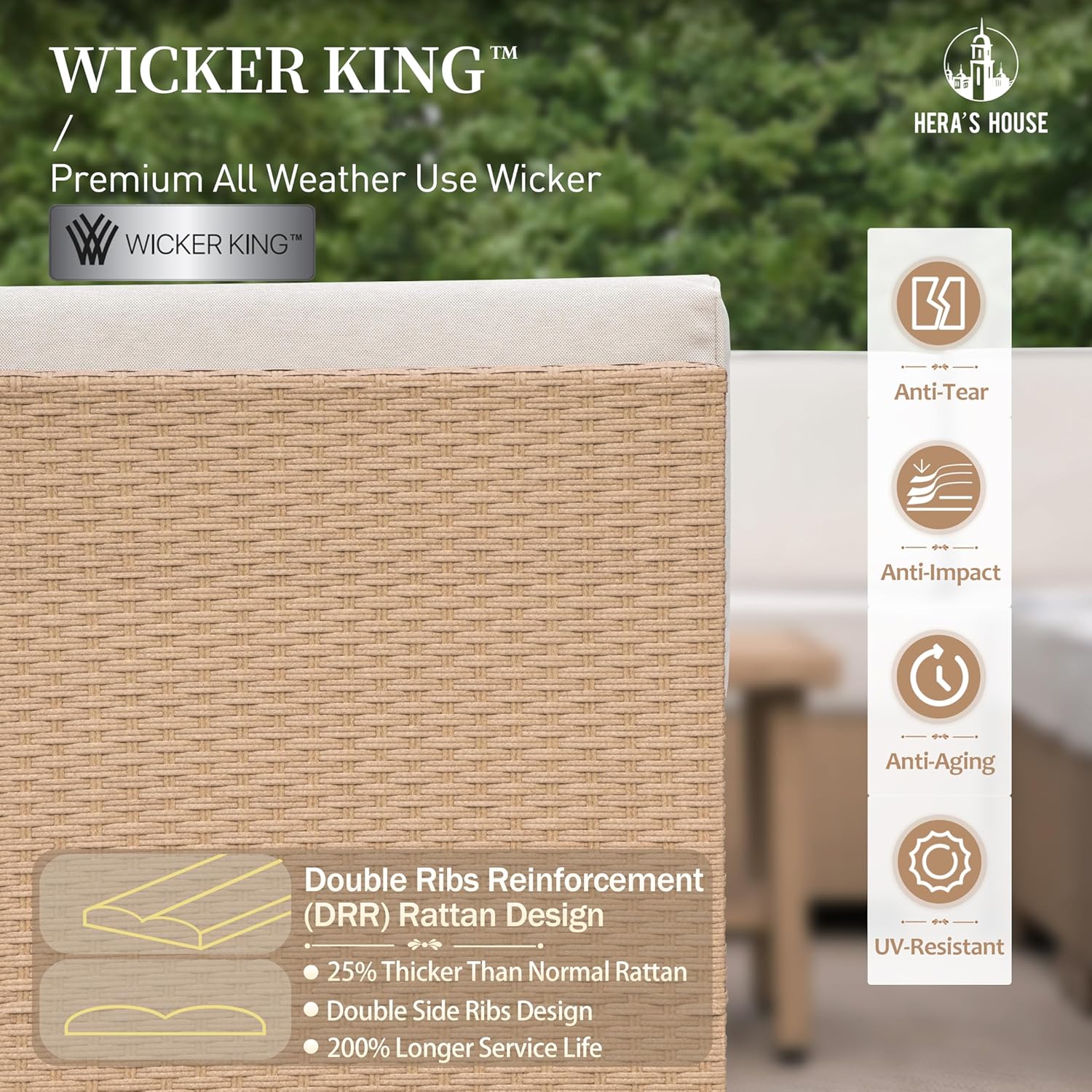 - 【Durable & All Weather Resistant】The premium rattan furniture is constructed with special WICKER KING, a 100% tightly handwoven, weather resistant PE willow branches, durable and prevent drying and cracking, ensuring lasting durability. Its sturdy structure ensures stability and safety, with each seat weighing 350lbs.