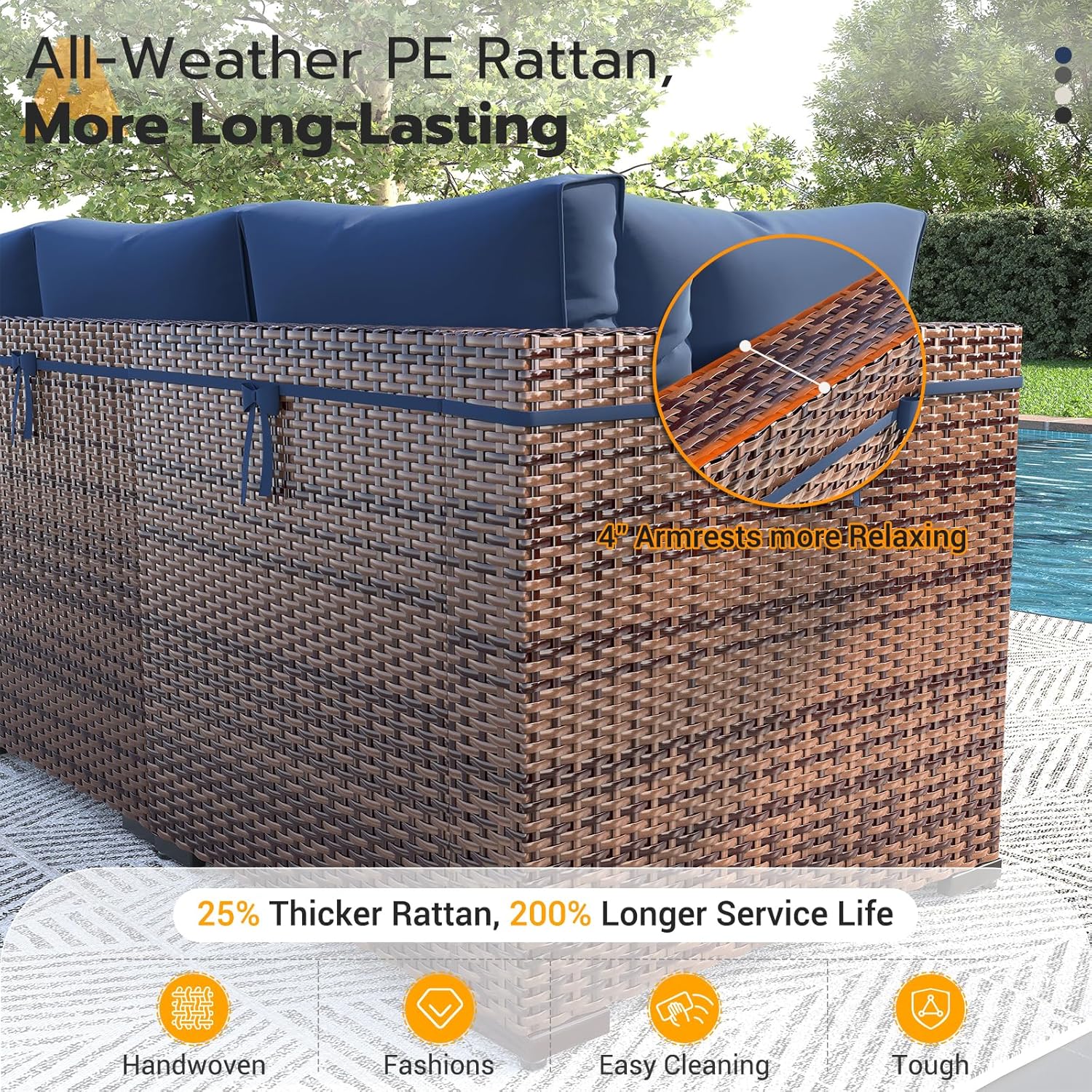 UDPATIO Patio Furniture Set, 7 Piece Outdoor Sectional Sofa, Modular Wicker Outdoor Furniture Conversation Sets with Waterproof Cover for Backyard Deck(Brown/Navy Blue)