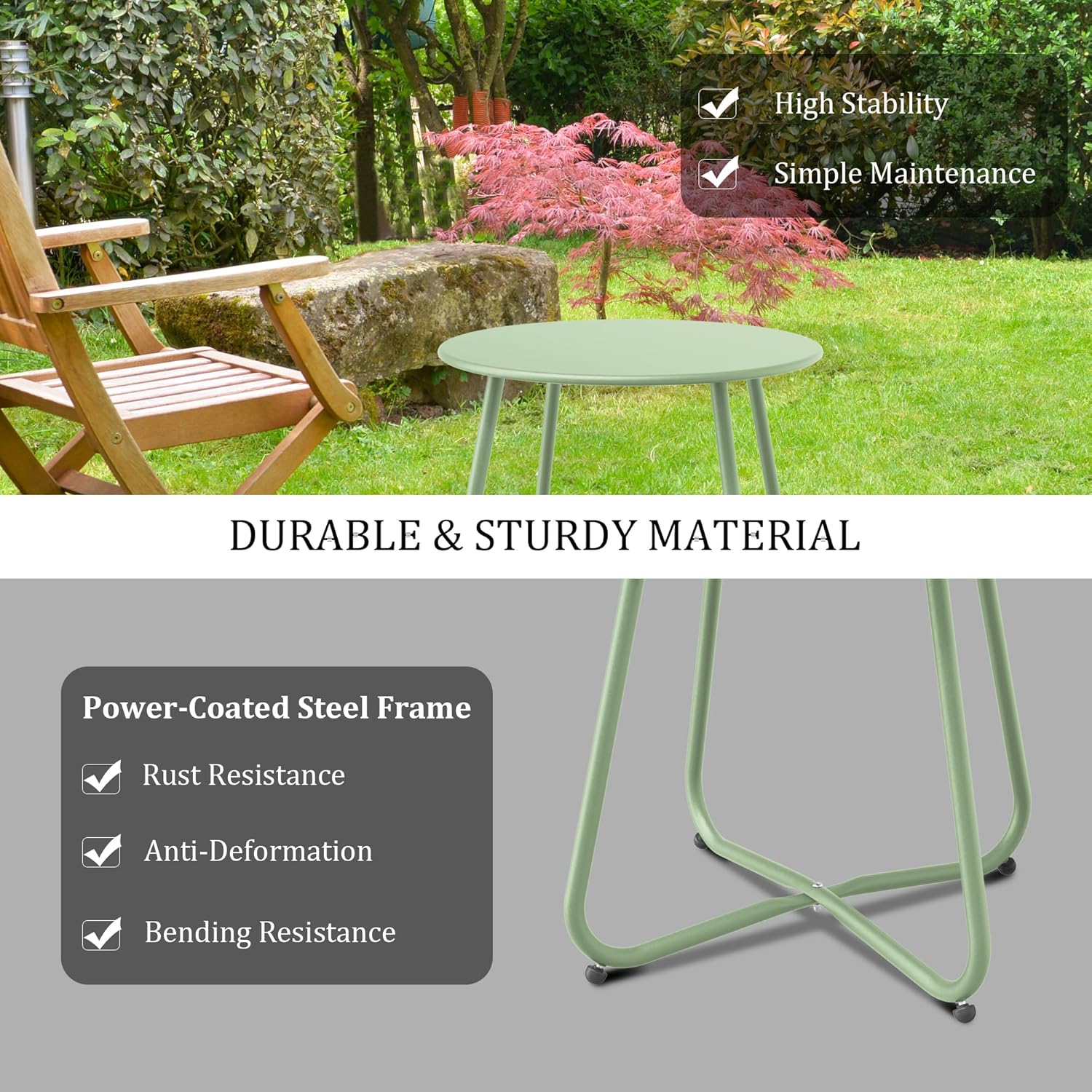 - Durability: The steel frame uses electrophoresis and powder coating technology to produce a glossy surface with anti-rust effect. An outdoor side table helps you fully enjoy the sun bath; the powder-coated end table is weather-resistant and waterproof, and the powder coating will not peel off. The outdoor end tables also has anti-scratch and anti-ultraviolet functions, so it can be used in the yard or on the balcony.
