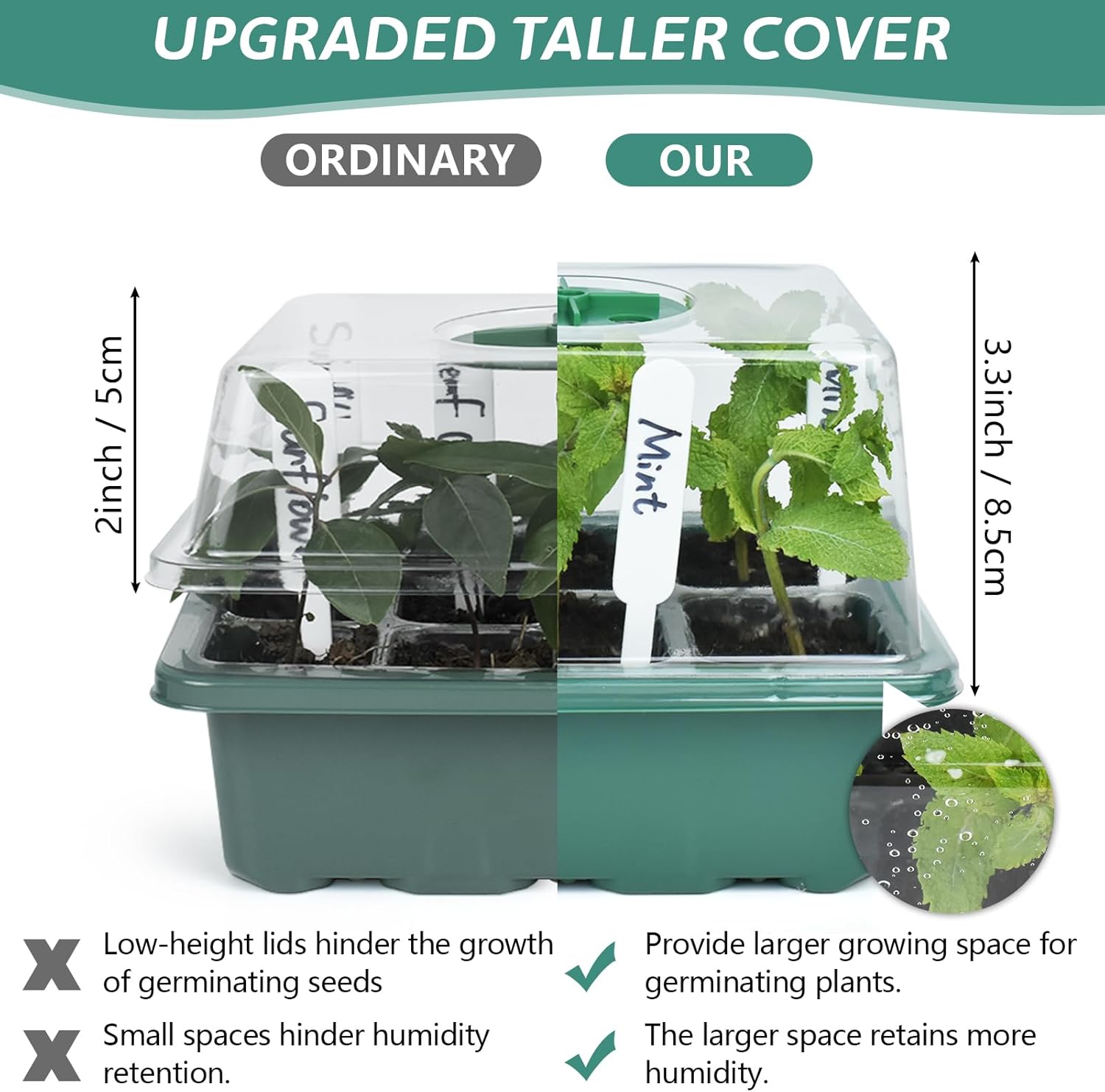 - Upgraded Taller Cover: The 8.5cm (3.3 inches) cover provides extra space for growing plants, better retaining humidity compared to standard 5cm (2 inches), promoting optimal seed germination and growth.